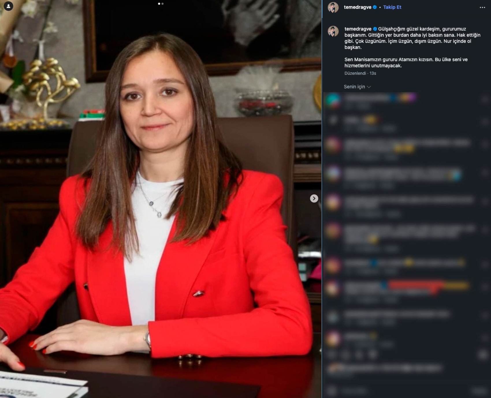 "Gülşahçığım güzel kardeşim, gururumuz başkanım… Gittiğin yer buradan daha iyi baksın sana. Hak ettiğin gibi. Çok üzgünüm. İçim üzgün, dışım üzgün. Nur içinde ol başkan. Sen Manisamızın gururu, Atamızın kızısın. Bu ülke seni ve hizmetlerini unutmayacak."