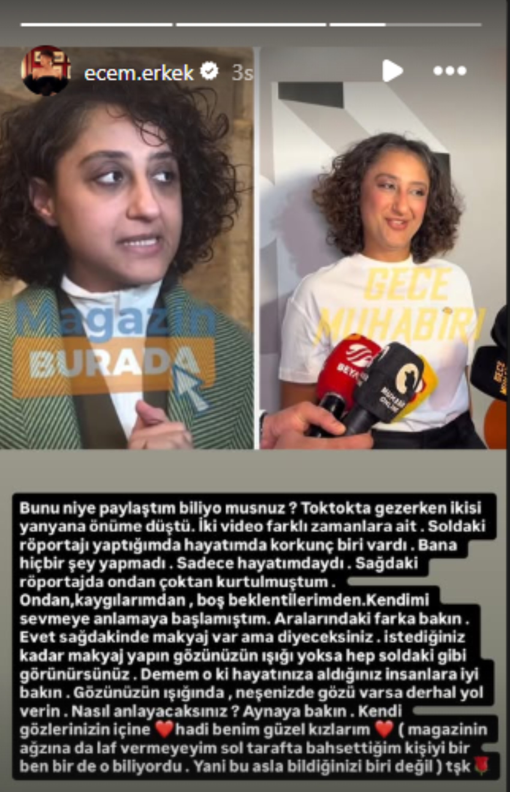 "Bunu niye paylaştım biliyor musunuz? TikTok'ta gezerken, ikisi yan yana önüme düştü. İki video farklı zamanlara ait... Soldaki röportajı verirken hayatımda korkunç biri vardı. Bana hiçbir şey yapmadı, sadece hayatımdaydı. Sağdaki röportajda ondan çoktan kurtulmuştum.