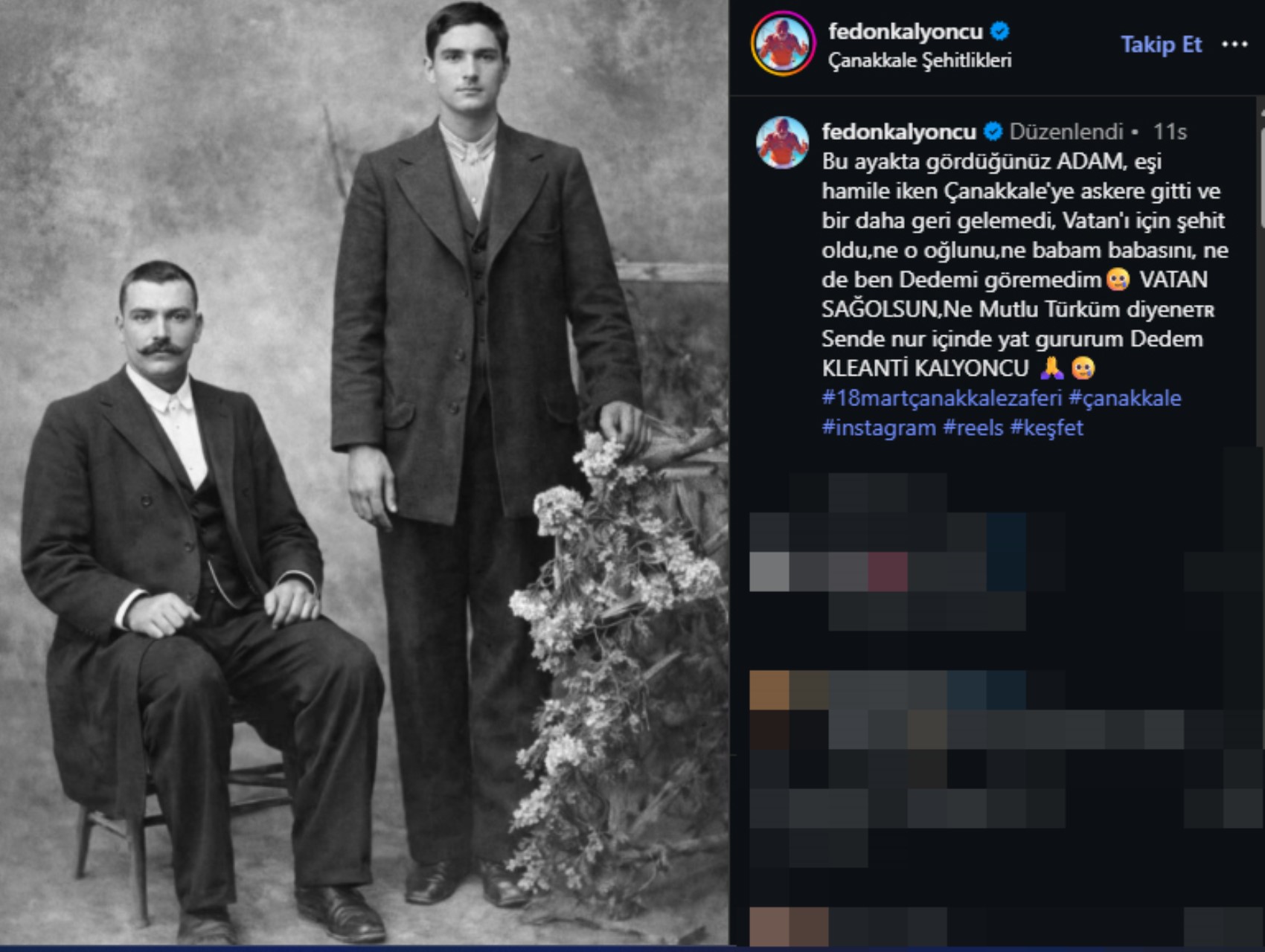 Fedon, Çanakkale şehidi dedesini yaptığı duygusal paylaşımla andı