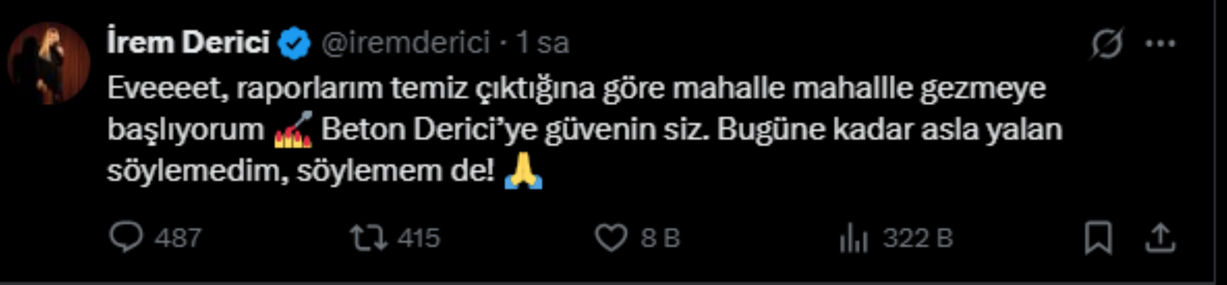 Test sonunda yeşil reçete ile satılan ve etken maddesinde uyuşturucu bulunan ilaçlar tespit edildiği anlaşılan İrem Derici sonuçlarının temiz çıkmasıyla ilgili olarak şu paylaşımda bulundu: