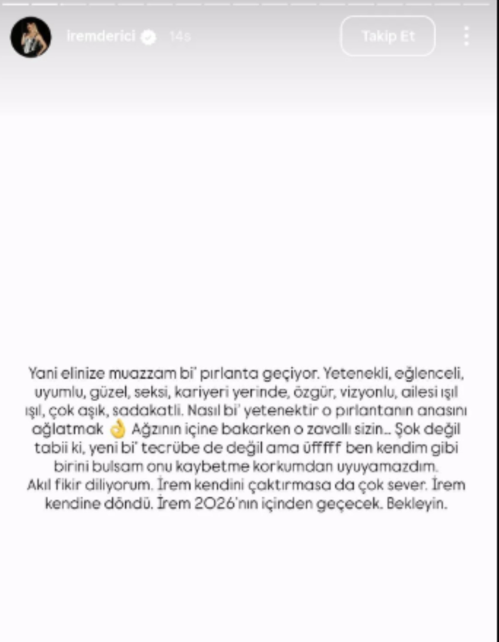 Derici, sosyal medya hesabından yaptığı özgüven dolu paylaşımıyla dikkat çekti. Derici paylaşımında “İrem 2026’nın içinden geçecek. Bekleyin.” dedi.