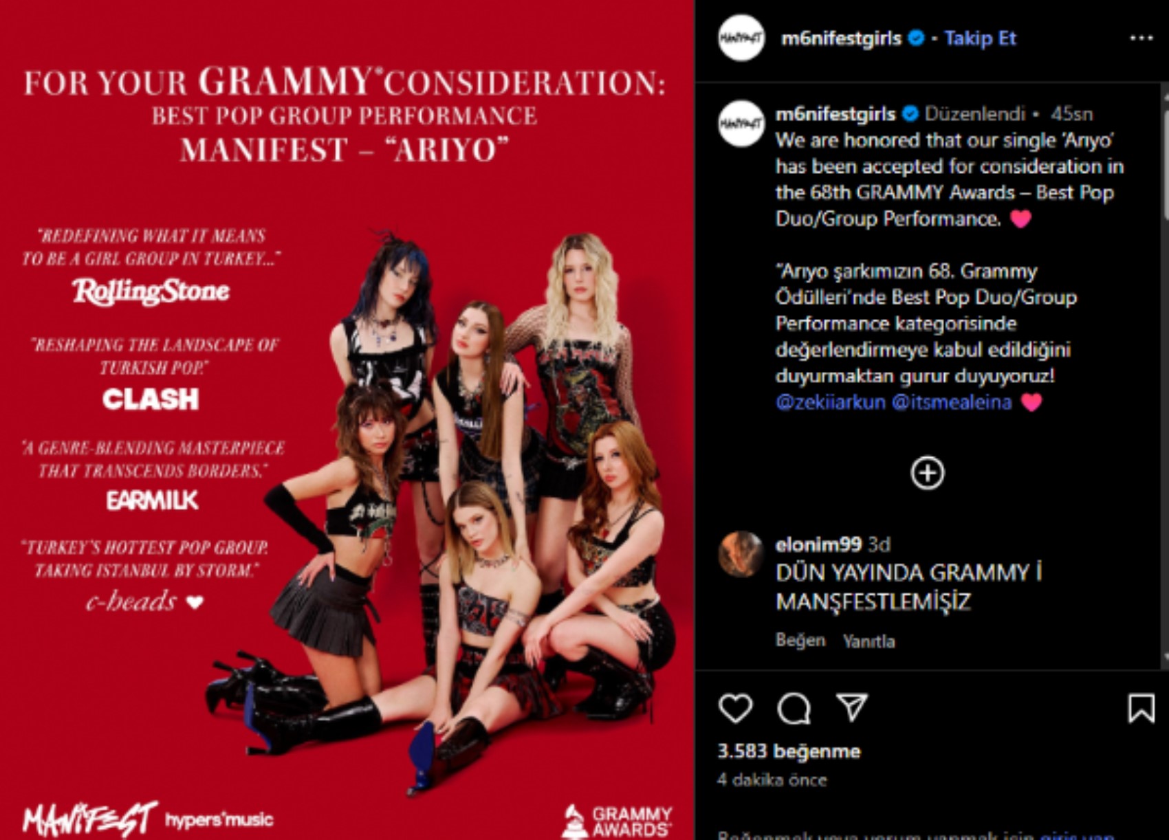 Manifest, en sevilen şarkılarından "Arıyo" şarkısının dünyanın en prestijli ödül törenlerinden 68. Grammy Ödülleri tarafından değerlendirmeye alındığını duyurdu.