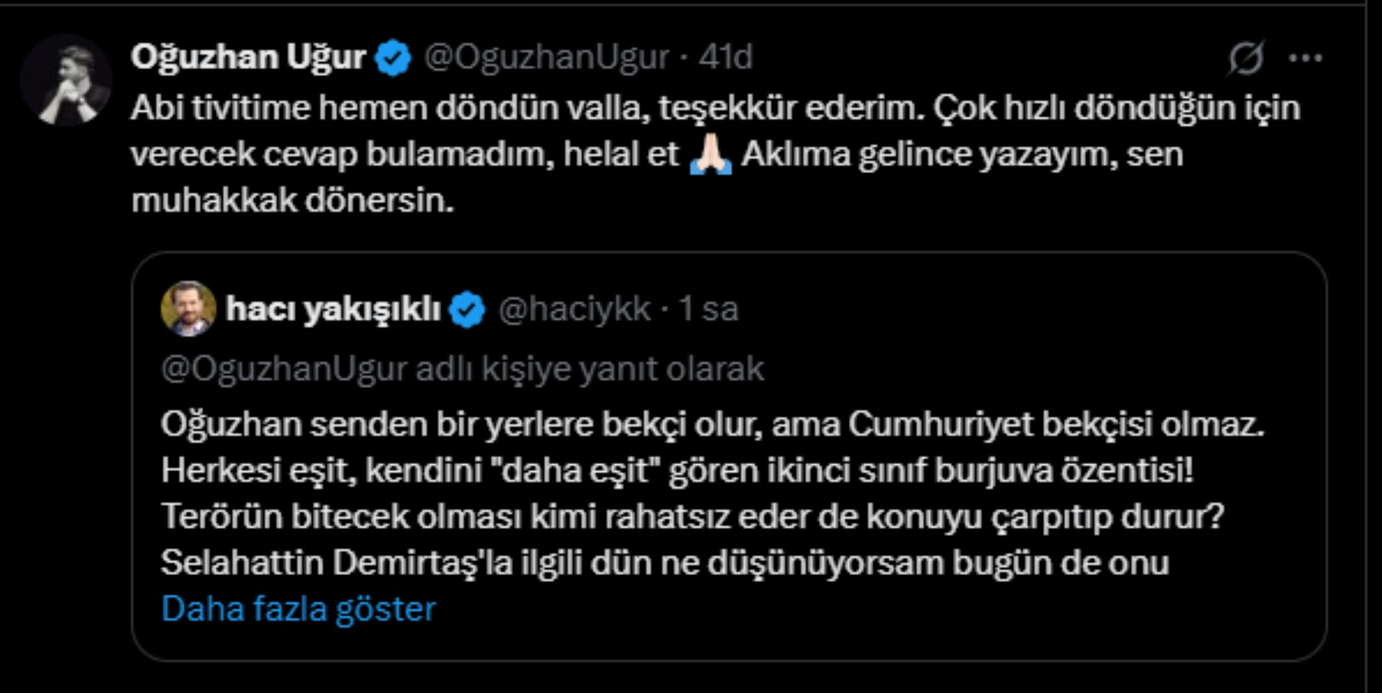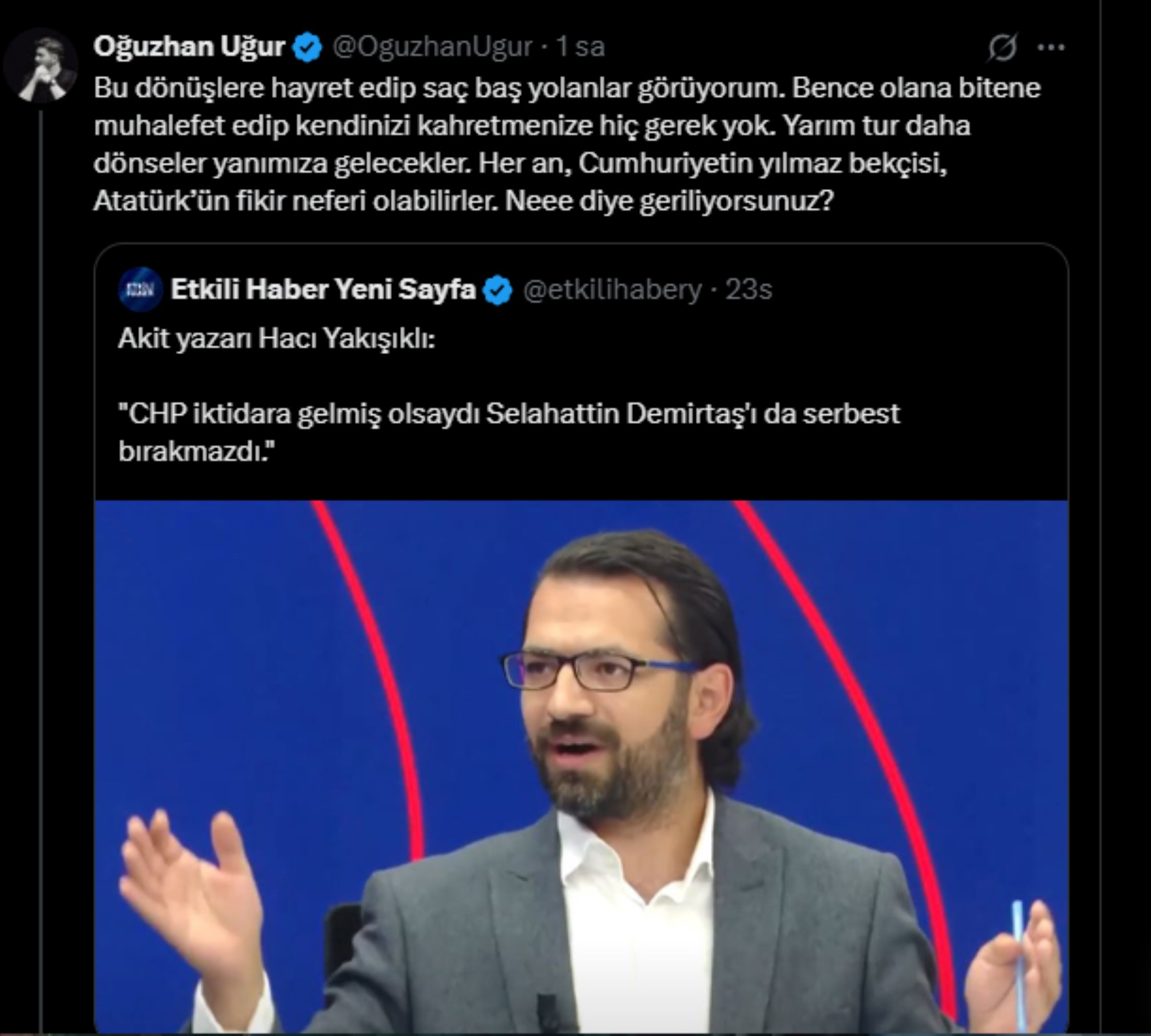 Babalatv kurucusu Oğuzhan Uğur, sosyal medya hesabı üzerinden Akit yazarı Hacı Yakışıklı'nın CHP ve Selahattin Demirtaş açıklamaları üzerinden 'yarım tur daha dönseler yanımıza gelecekler' yorumunu yaptı, ikili arasında karşılıklı atışma yaşandı.