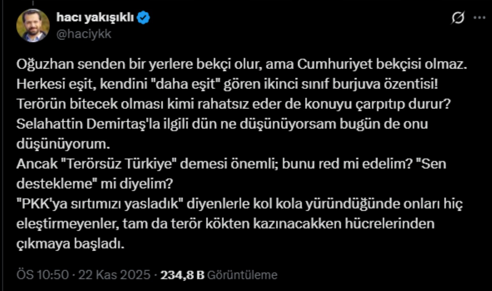 CHP'nin İmralı'ya gitmeme kararı ardından yandaş kalemler ve troller CHP'nin teröre destek verdiği yönünde açıklamalarda bulunurken, Babalatv kurucusu Oğuzhan Uğur, Akit yazarı Hacı Yakışıklı'nın "CHP iktidara gelmiş olsaydı Selahattin Demirtaş'ı da serbest bırakmazdı" sözlerini hatırlattı ve şu yorumda bulundu: