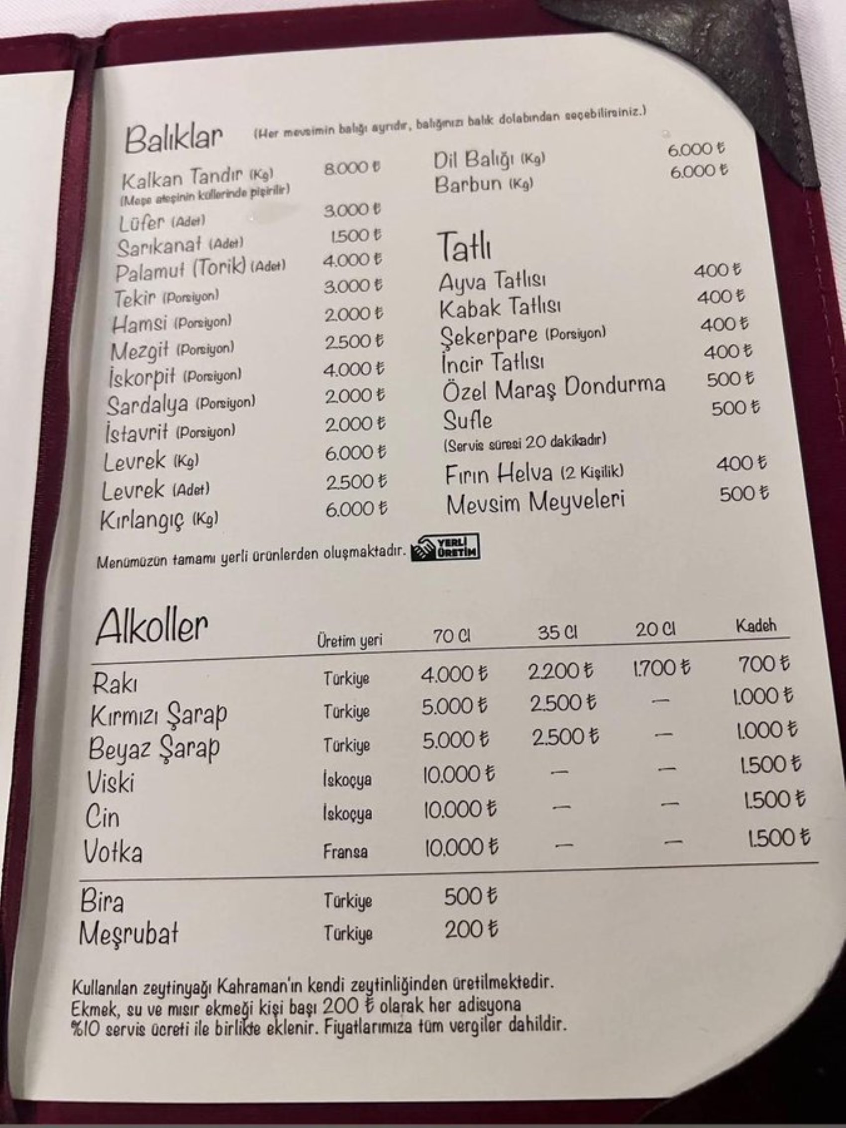 Menüde ayrıca ek ücret bilgilerine de yer verildi. İşletmenin açıklamasında, "Ekmek, su ve mısır ekmeği kişi başı 200 TL olarak ücretlendirilir. Her adisyona yüzde 10 servis ücreti eklenir." ifadesi kullanıldı.