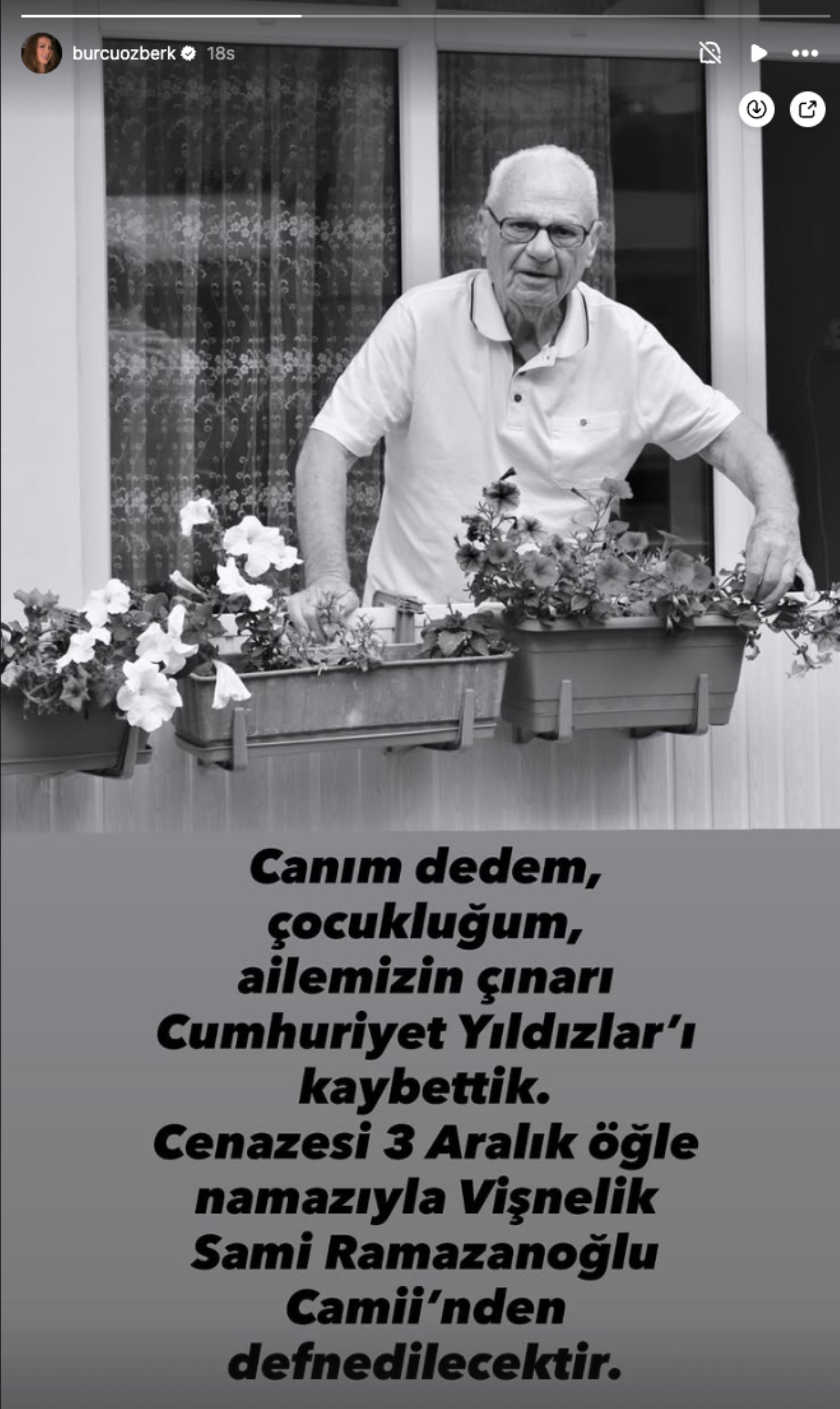 Ünlü oyuncu Burcu Özberk, sosyal medya hesabından yaptığı duygusal bir paylaşımla dedesinin vefatını takipçilerine bildirdi.