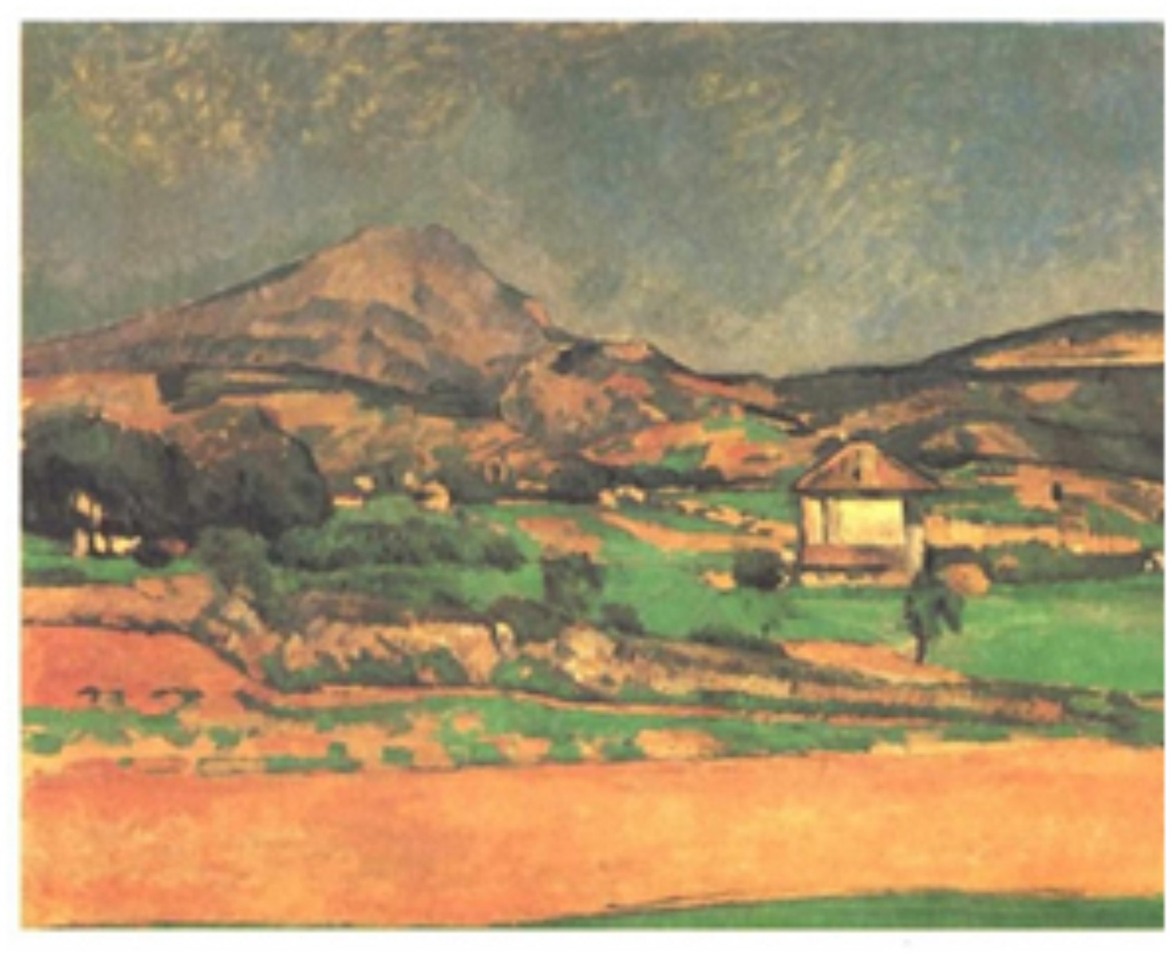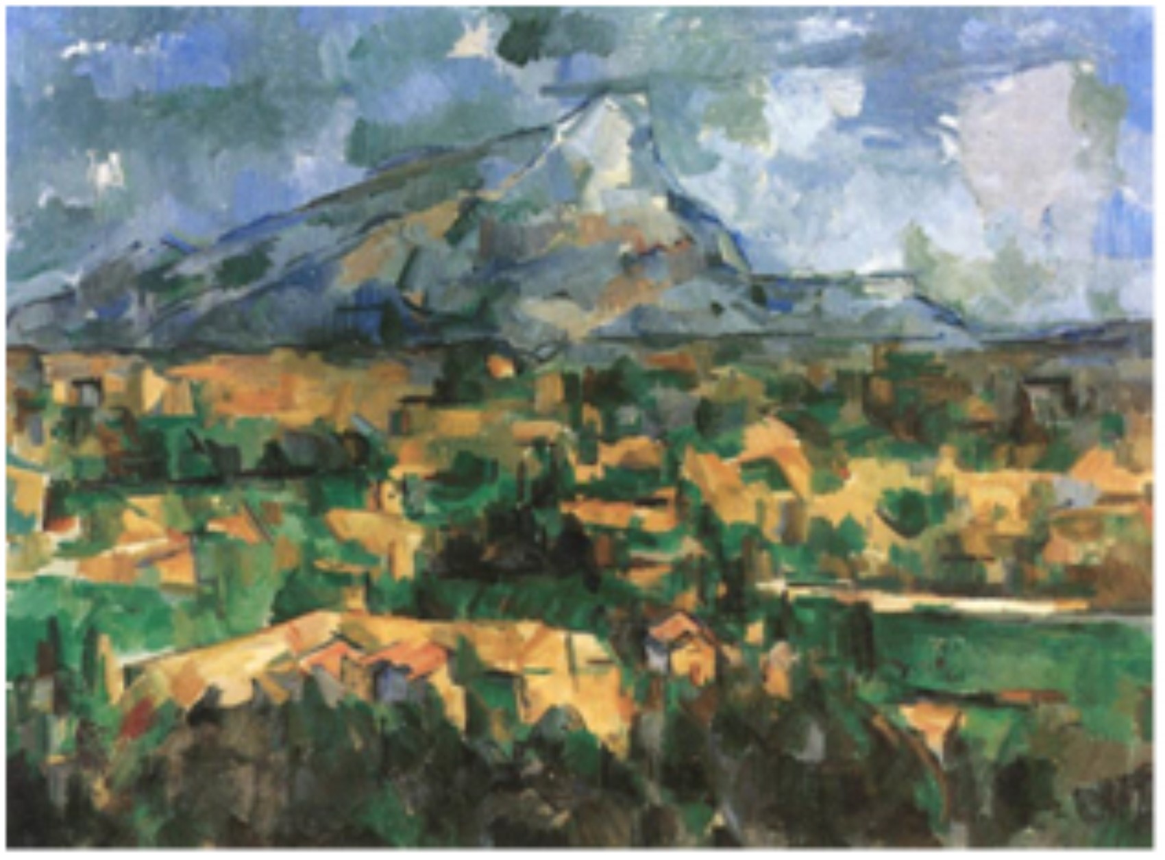 Aşağıdaki resim Mont Sainte-Victoire Dağı’nı model olarak kullandığı ilk yapıtlarından biridir. Resmin yüzeyini kapsayan, başta dağ olmak üzere her şey biçim olarak anlaşılabilir haldedir. Biçimler, renk yoluyla birbirinin içinde eritilmemiştir. Resim perspektife uygun olarak kompoze edilmiş olduğu için oluşan derinlik duygusu gerçeklik etkisini arttırmaktadır. Bu resimde belirleyici olan sanatçının duygu ve düşüncelerinden daha çok doğanın gerçekçi bir üslupla yansıtılması olmuştur.