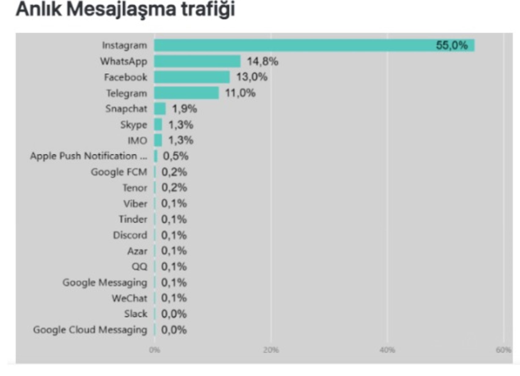 Instant Messaging (Anlık Mesajlaşma) kategorisinde yaygın olarak kullanılan uygulamalara grafikte yer verilmiş. Bu grafikte yer alan verilere göre Instant Messaging kategorisinde en yaygın olarak kullanılan uygulama yüzde 55,0’lık oranla Instagram oluyor. Instagram’ı sırasıyla WhatsApp (yüzde 14,8), Facebook (yüzde 13,0) ve Telegram (yüzde 11,0) takip ediyor.