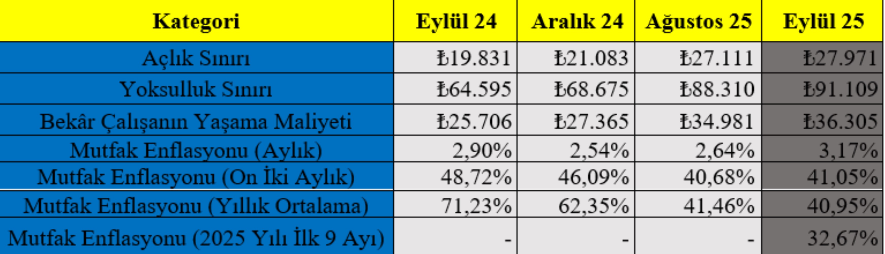 TÜRK-İŞ’in “Eylül 2025 Açlık ve Yoksulluk Sınırı Araştırması”, yalnızca ekonomik değil; aynı zamanda toplumsal ve ahlaki bir çöküşün eşiğine gelindiğini, aşağıdaki tabloda yer alan rakamlarla çarpıcı biçimde ortaya koyuyor.