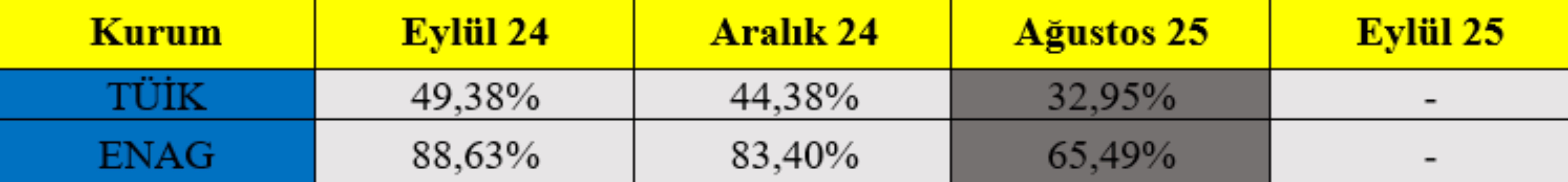 Sorunu daha net görebilmek için TÜİK ve ENAG verilerine daha detaylı bakmak gerekir. Her ne kadar yazıyı kaleme aldığım saatlerde Eylül ayı henüz açıklanmamış olsa da, Ağustos 2025 sonuçları önemli ipuçları sunuyor. Aşağıdaki tabloda da görüleceği üzere, TÜİK, tüketici fiyatlarındaki (TÜFE) yıllık artışı %32,95 olarak açıklarken, ENAG aynı dönemde enflasyonu %65,49 olarak hesapladı. Bu farklılık, resmi verilerle halkın hissettiği gerçek enflasyon arasındaki makası gösteriyor. TÜRK-İŞ’in mutfak enflasyonu verileriyle birlikte düşünüldüğünde, tablo yalnızca fiyatlardaki artışı değil, halkın sofrasına ve cüzdanına yansıyan somut krizi de gözler önüne seriyor.