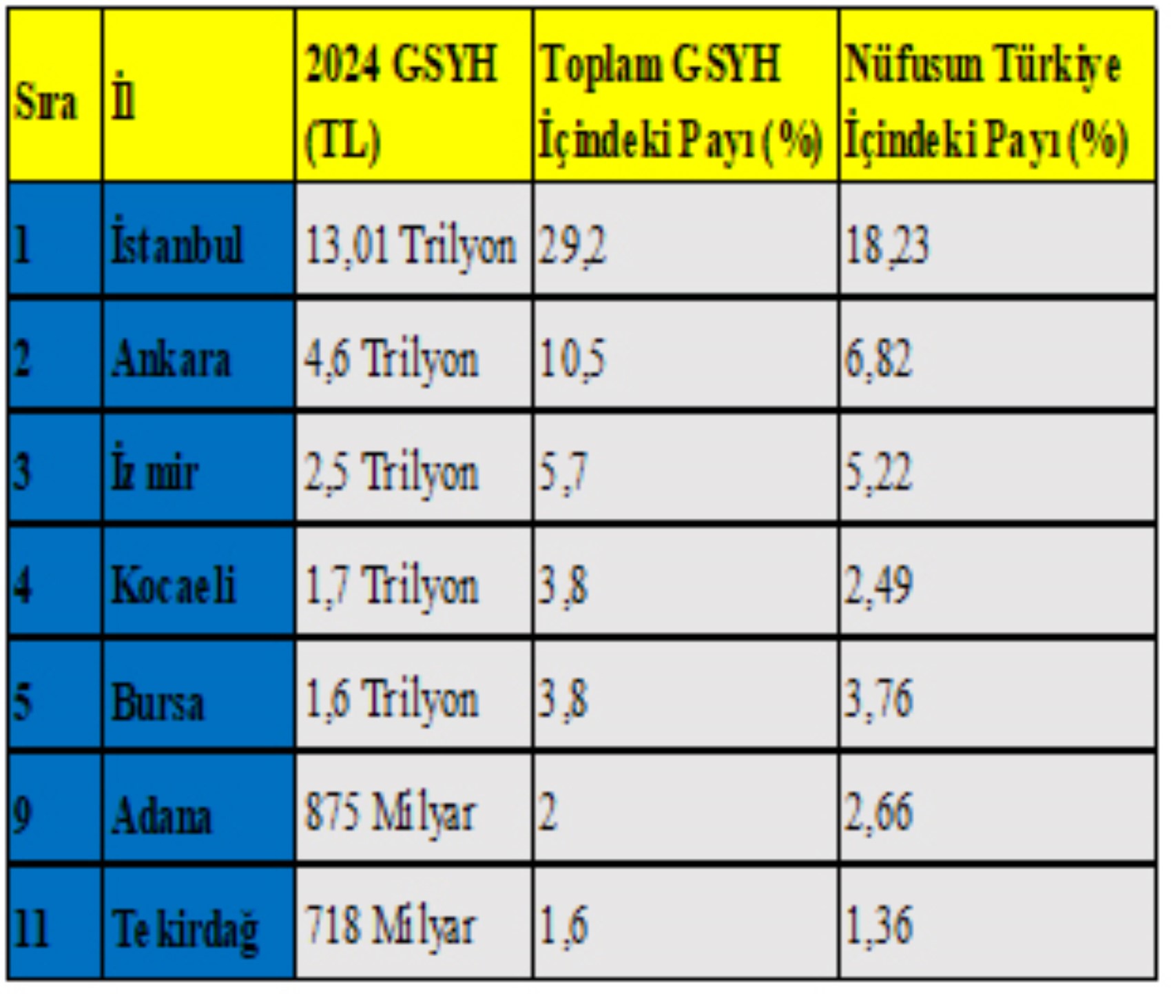 Tekirdağ ise 718 milyar TL’lik üretim hacmiyle 11. sırada yer alıyor ve yüzde 1,6’lık payıyla nüfus ağırlığının üzerinde bir performans sergiliyor. Kişi başına GSYH 604 bin 226 TL (18.406 $) ile4. sırada bulunması, ilin üretim ve verimlilik açısından güçlü bir konumda olduğunu gösteriyor.