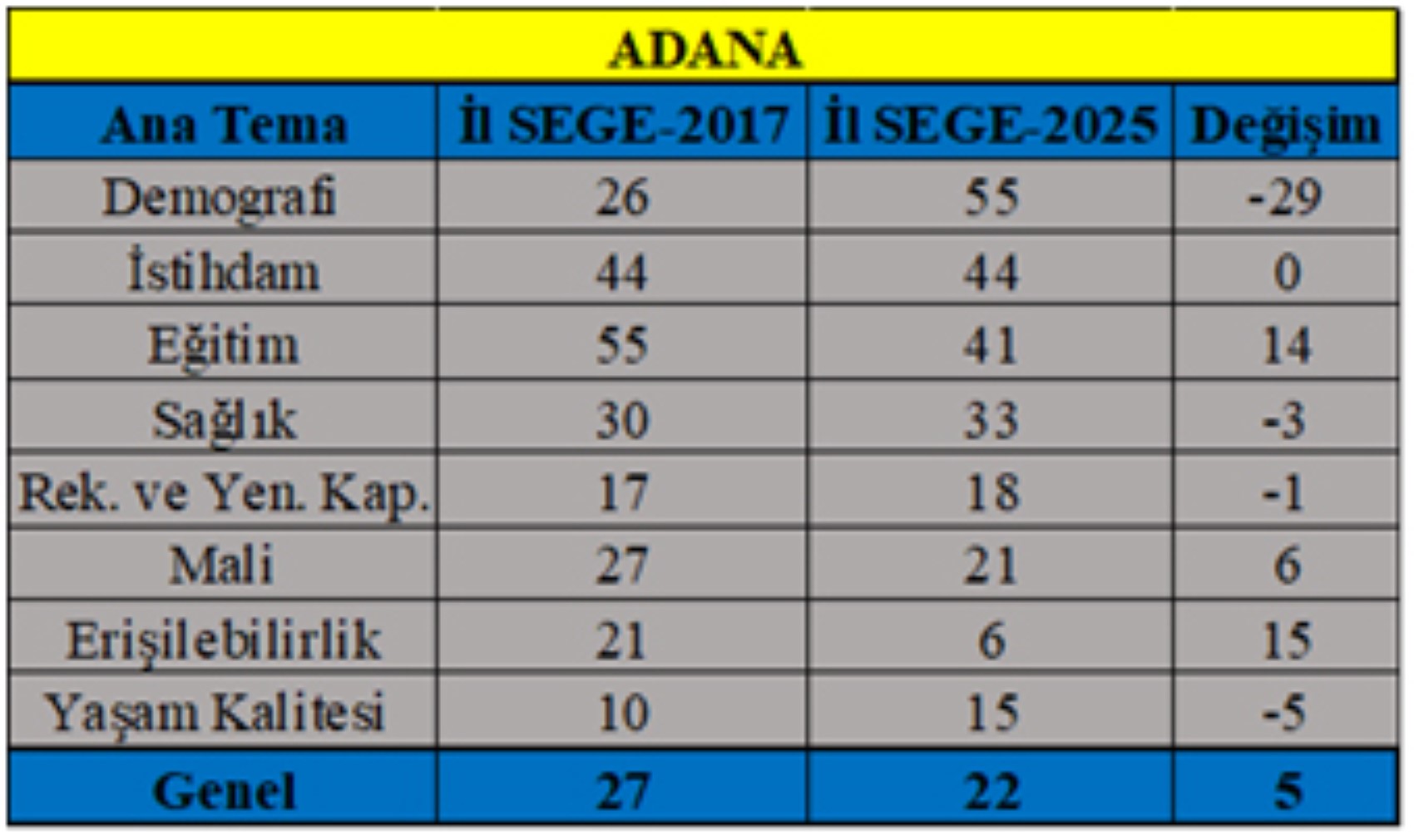 Buna karşın 22. sırada bulunan Adana, tarım, sanayi ve lojistik alanlarında avantajlara sahip olmasına rağmen kişi başına düşen gelir ve işsizlik gibi yapısal sorunlar nedeniyle performansı görece düşük kalıyor.Deprem sonrası süreç de SEGE sıralamalarında etkisini gösteriyor. Kahramanmaraş, Hatay ve Adıyaman gibi illerde yaşanan gerileme, afetlerin yalnızca fiziki yıkım değil; beşerî sermaye, ekonomik faaliyet ve sosyal altyapı üzerinde de kalıcı izler bıraktığını gösteriyor. Doğu ve Güneydoğu Anadolu’daki bazı illerin alt sıralarda kalmaya devam etmesi ise yapısal kalkınma sorununun sürdüğüne işaret ediyor.