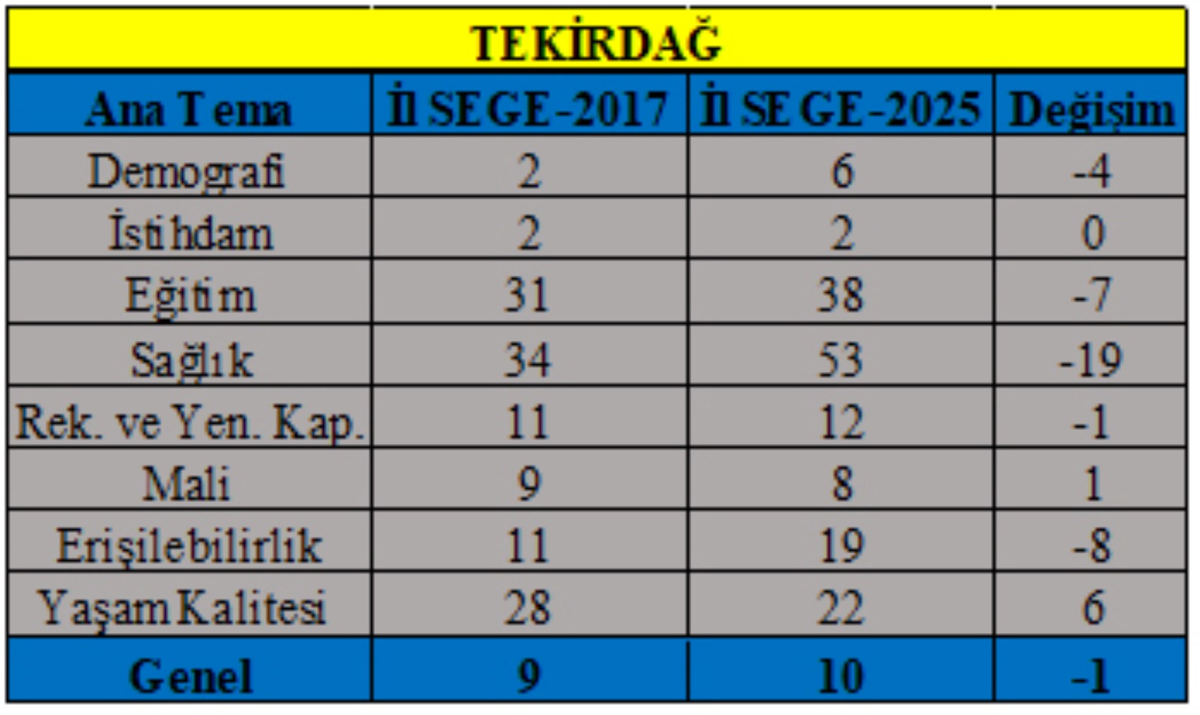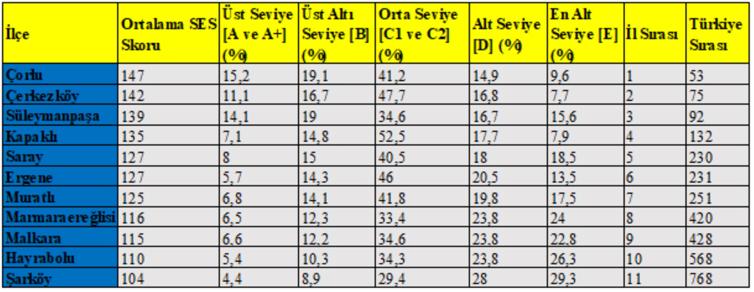 Tekirdağ, SES 2023 verilerine göre 135 puanla Türkiye genelinde 7. sırada yer almakta; en yüksek sosyoekonomik seviyeye sahip iller arasında bulunmakta ve Marmara Bölgesi’nin önde gelen sanayi merkezlerinden biri olarak öne çıkmaktadır. Ancak tıpkı Adana’da olduğu gibi, Tekirdağ’da da bu görece yüksek ortalama, ilçe bazındaki eşitsizlikleri gizlemektedir.