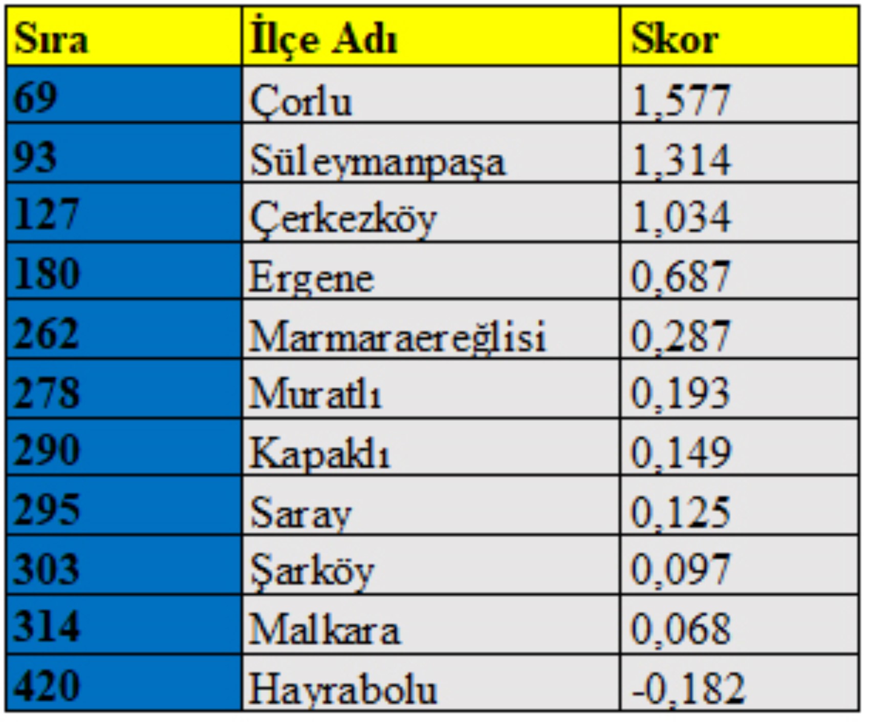 Bu tablo, sanayiye entegre olan ilçeler ile tarım ağırlıklı ilçeler arasında belirgin bir refah farkı olduğunu gösteriyor. Tekirdağ’da iki ayrı ekonomik gerçeklik yan yana varlığını sürdürüyor.