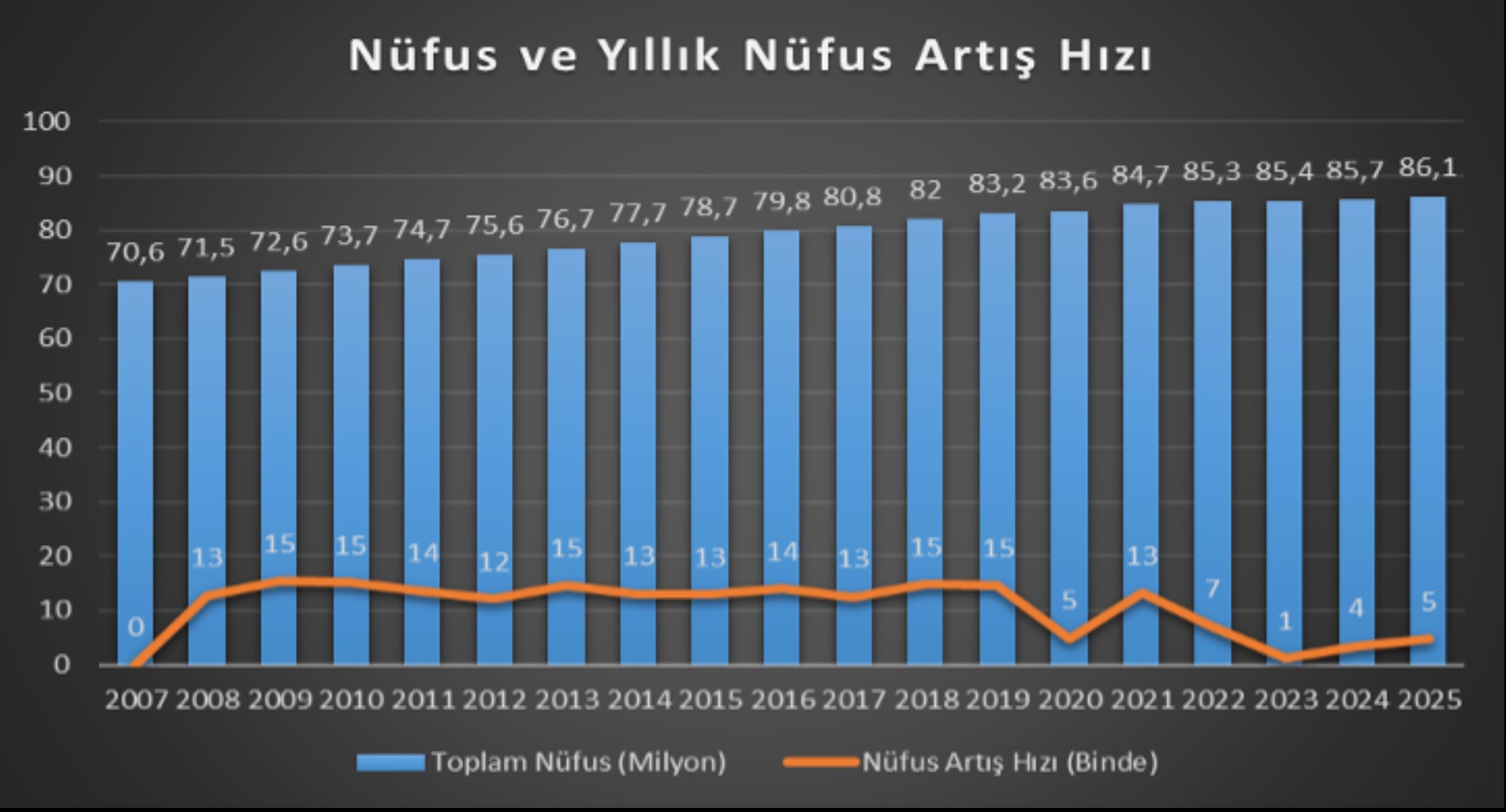 Türkiye İstatistik Kurumu tarafından açıklanan 2025 yılı Adrese Dayalı Nüfus Kayıt Sistemi (ADNKS) sonuçları, Türkiye’nin yalnızca büyüyen değil; aynı zamanda hızla yaşlanan ve belirli merkezlerde yoğunlaşan yeni bir demografik evreye girdiğini göstermektedir. 31 Aralık 2025 itibarıyla nüfus 427 bin 224 kişilik artışla 86 milyon 92 bin 168’e ulaşmış, yıllık artış hızı binde 5 olarak gerçekleşmiştir.