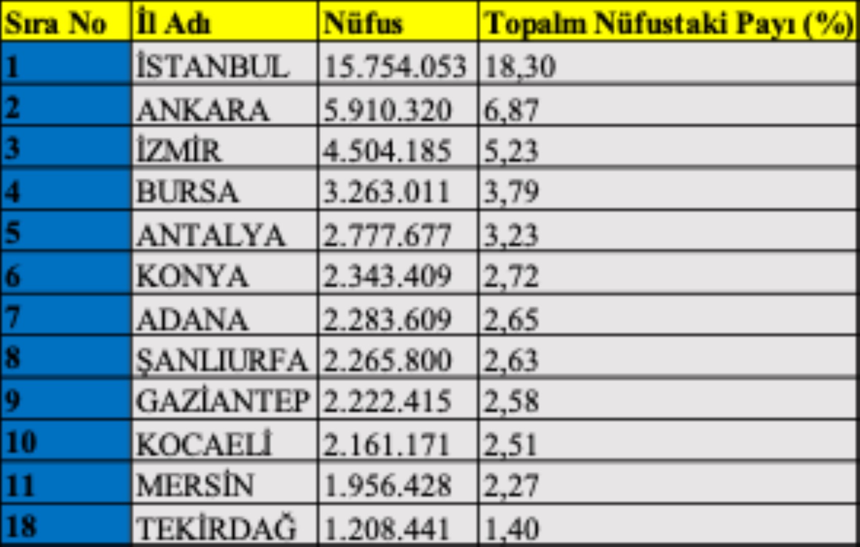 Buna karşılık Bayburt, Tunceli, Ardahan, Gümüşhane ve Kilis gibi iller düşük nüfus büyüklükleriyle listenin alt sıralarında yer almaktadır.