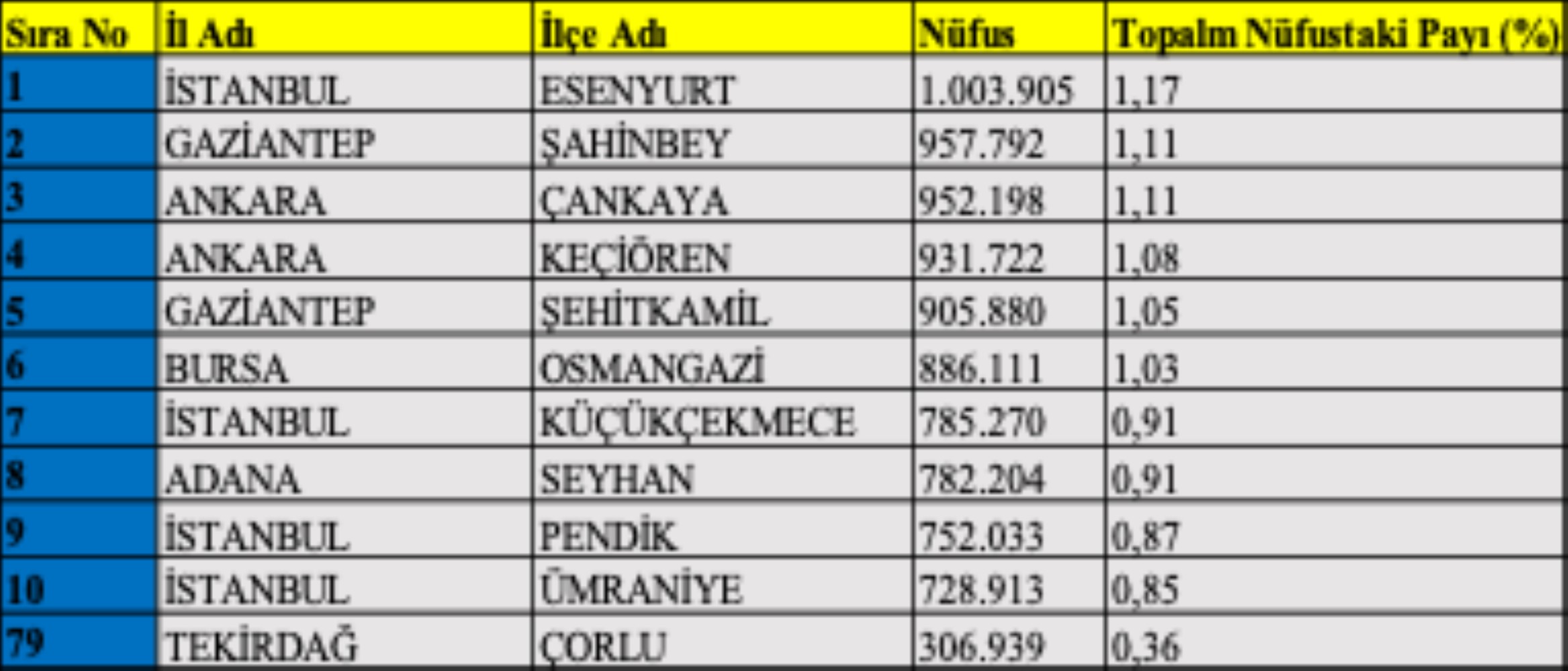 İlçe ölçeğinde de benzer bir tablo görülmektedir. İstanbul’un Esenyurt ilçesi 1 milyonu aşan nüfusuyla yeni bir eşiği temsil ederken; bazı ilçelerde nüfus birkaç bin kişiye kadar gerilemiştir. Bir yanda milyonluk metropol ilçeleri, diğer yanda iki-üç bin nüfuslu yerleşimler… Bu keskin fark, Türkiye’de demografik dağılımın giderek daha belirgin bir mekânsal eşitsizlik içerdiğini göstermektedir.