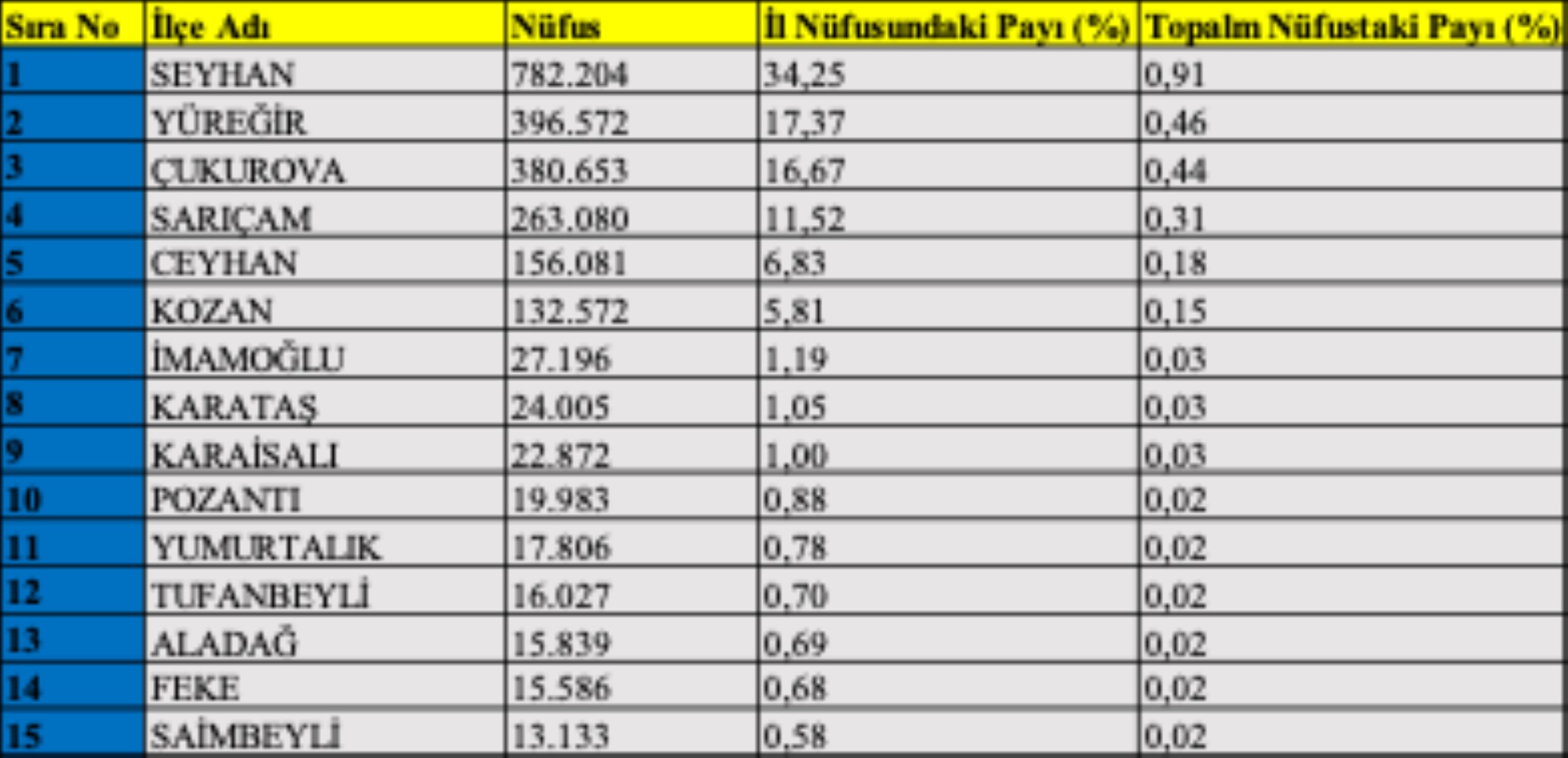 İlçe dağılımı, kentin iç mekânsal yoğunlaşmasını açık biçimde ortaya koymaktadır. Seyhan 782 bin 204 kişilik nüfusuyla açık ara ilk sırada yer almakta; Yüreğir ve Çukurova ile birlikte kentin ana demografik çekirdeğini oluşturmaktadır. Sarıçam’ın da eklenmesiyle dört merkez ilçe, Adana nüfusunun büyük bölümünü barındırmaktadır. Buna karşılık dağlık ve kırsal ilçelerde nüfus 20 binin altına kadar düşmektedir. Bu fark, il içindeki ölçek dengesizliğini net biçimde göstermektedir.