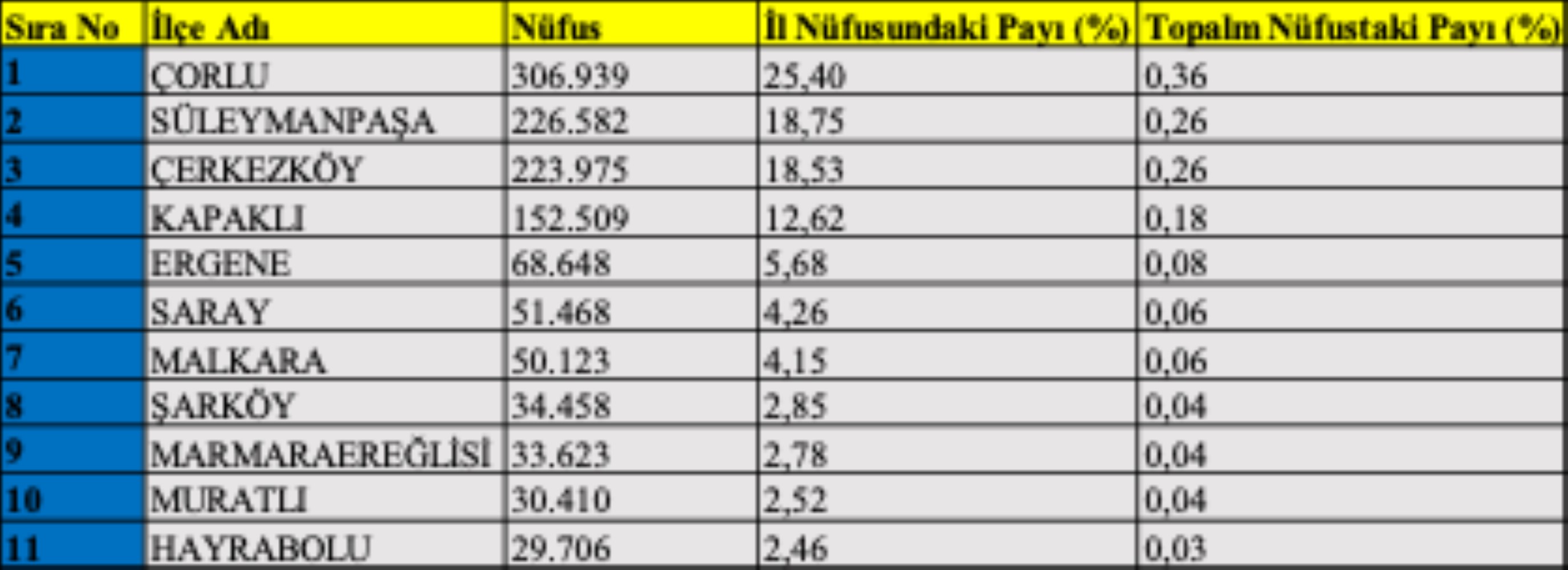 İstanbul’a yakınlık, organize sanayi bölgeleri ve gelişmiş lojistik altyapı Tekirdağ’ı Marmara üretim havzasının önemli bir parçası haline getirmiştir. Özellikle Çorlu, Çerkezköy ve Kapaklı hattı, sanayi eksenli büyümenin demografik yansımasını oluşturmaktadır. Bu üç ilçe ile il merkezi Süleymanpaşa birlikte değerlendirildiğinde, nüfusun büyük bölümünün üretim ve lojistik aksında yoğunlaştığı görülmektedir.