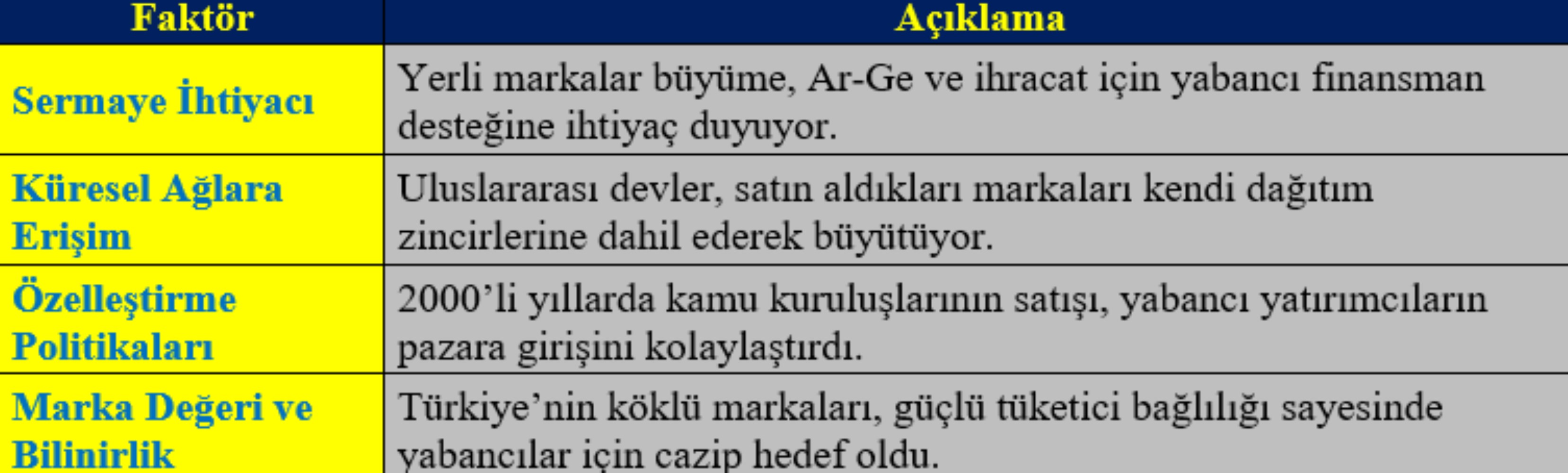 Türkiye’de yerli markaların yabancı sermaye tarafından satın alınmasının ardında çoğu zaman gönüllü tercihler değil, yapısal zorunluluklar yatıyor. Aşağıdaki tablodada özetlendiği üzere; Sermaye yetersizliği, yüksek finansman maliyetleri, kur oynaklığı ve ölçek büyütme gereksinimi, pek çok markayı dış kaynağa yöneltiyor. Uluslararası devlerin geniş dağıtım ağları, finansal gücü ve küresel marka yönetimi deneyimi kısa vadede cazip görünüyor. Özelleştirme politikaları da yabancı yatırımcıların pazara girişini kolaylaştırarak bu süreci hızlandırdı.