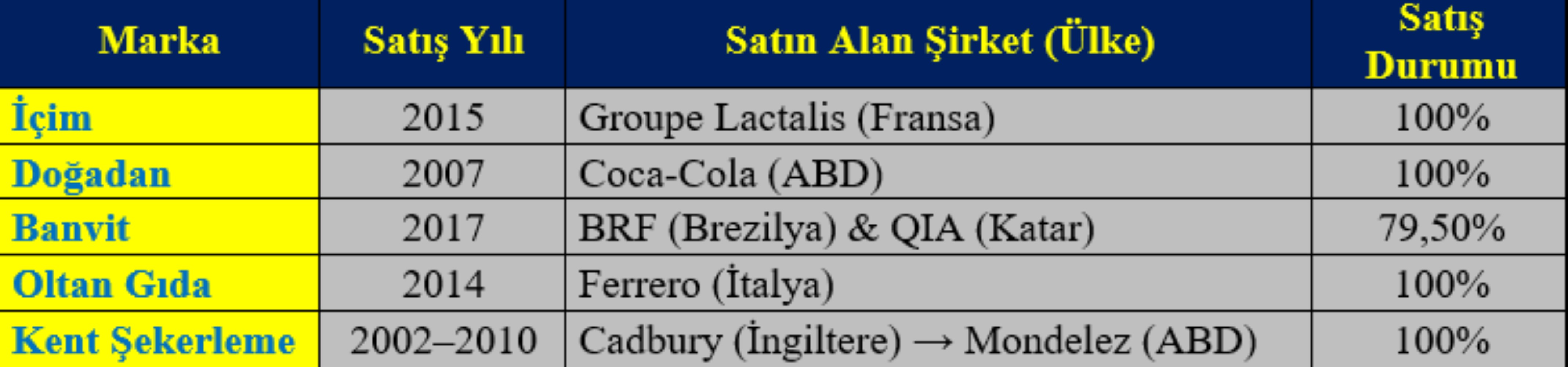 Türkiye’nin gıda markaları, 2000’li yıllardan itibaren uluslararası şirketlerin yoğun ilgisiyle karşılaştı. Birçok yerli marka, sermaye ihtiyacını karşılayamadığı için yabancı yatırımcılara devredildi. Aşağıdaki tabloda özetlendiği üzere; 2000’li yıllarda Türkiye’nin güçlü olduğu gıda sektörü, yabancı ilgisinin odağı haline geldi: İçim (Lactalis), Doğadan (Coca-Cola), Banvit (BRF & QIA), Oltan Gıda (Ferrero) ve Kent (Mondelez) örnekleri, bu sürecin en bilinenleri. Bu satışlarla birlikte üretim sürse de karar merkezleri yurt dışına taşındı; kâr transferleriyle net döviz kaybı oluştu.