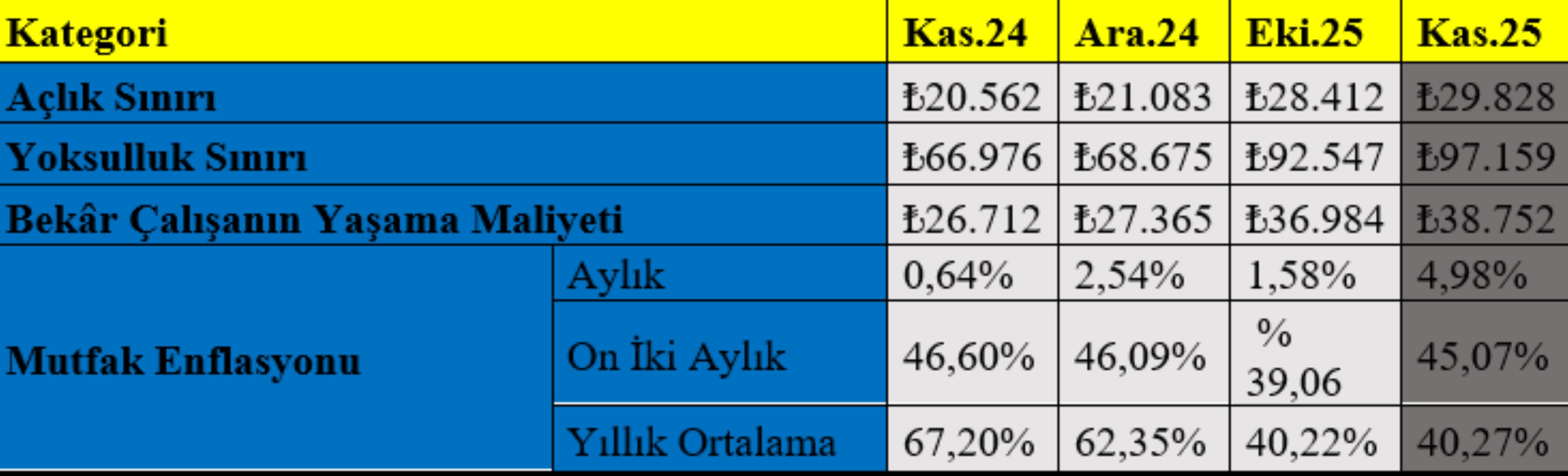 TÜRK-İŞ’in Kasım 2025 verileri, Türkiye’nin mutfağında kaynayan gerçek krizi tüm çıplaklığıyla ortaya koyuyor. Dört kişilik bir ailenin sağlıklı beslenebilmesi için yapması gereken aylık gıda harcaması, yani açlık sınırı 29.828 TL’ye yükselirken; barınma, ulaşım ve diğer zorunlu giderlerle birlikte yoksulluk sınırı 97.159 TL’ye dayandı. Açlık ile insanca yaşam arasındaki mesafe her ay biraz daha açılırken, 22.105 TL’lik asgari ücret yalnızca mutfak masrafının bile 7.723 TL gerisinde kalıyor. Bu da geçim krizinin artık toplumun geniş kesimlerinde somut ve hissedilir bir gerçekliğe dönüştüğünün en net göstergesi.