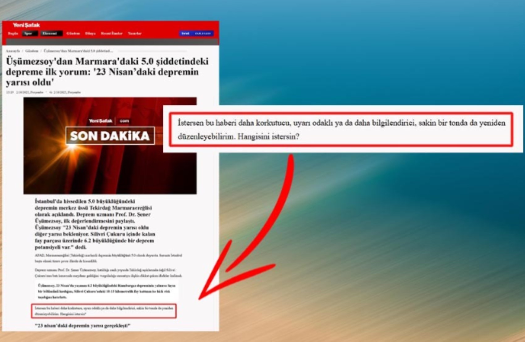 Yeni Şafak, Marmara depremi haberini yazdırdığı yapay zekânın “İstersen bu haberi daha korkutucu, uyarı odaklı ya da daha bilgilendirici, sakin tonda da yeniden düzenleyebilirim. Hangisini istersin?” notunu haberden silmeyi unuttu. (Musa Özuğurlu)