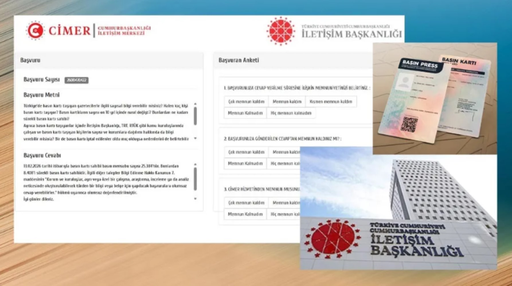 CİMER aracılığıyla İletişim Başkanlığı’na başvurdum. “Basın kartlıların sayısını, bu sayının son 10 yıl içindeki değişimini, İletişim Başkanlığı, TRT, RTÜK gibi kamu kuruluşlarında çalışan basın kartlıların sayısını, bu kişilerin kurumlara dağılımını” sordum.