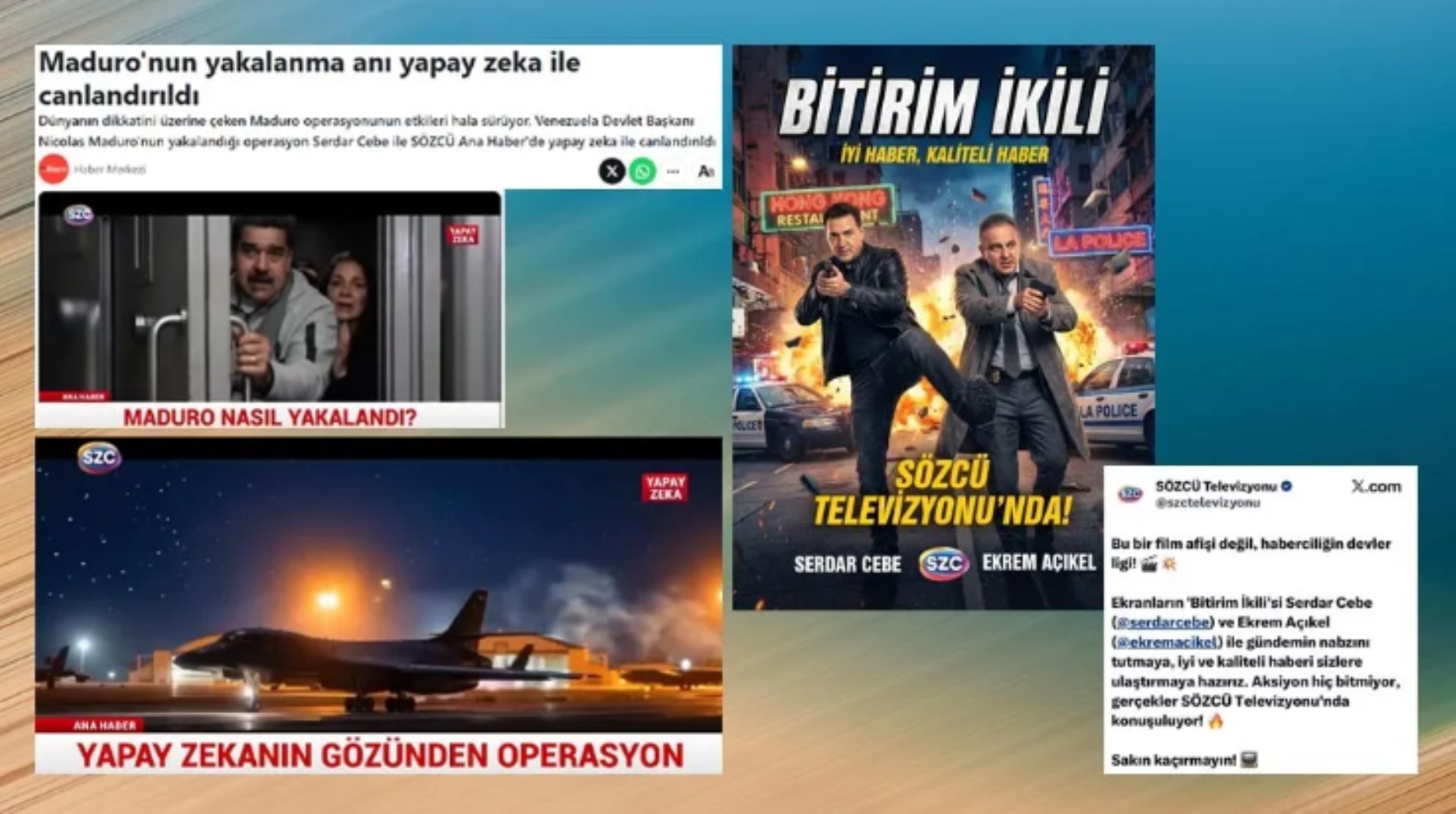 Bir haber kanalının haberciliğini bu şekilde tanıtması, hakikat peşinde nasıl koşacaklarına dair endişe verici. Anımsanırsa geçen hafta da Venezuela Devlet Başkanı Maduro’nun ABD askerleri tarafından konutundan kaçırılmasını yapay zekâ ile canlandırıp, Sözcü TV haber bülteninde bir aksiyon filmi gibi yayımlamışlardı. Şiddeti kutsamış, ABD’nin “hegemonik gücünü” meşrulaştırmışlardı.