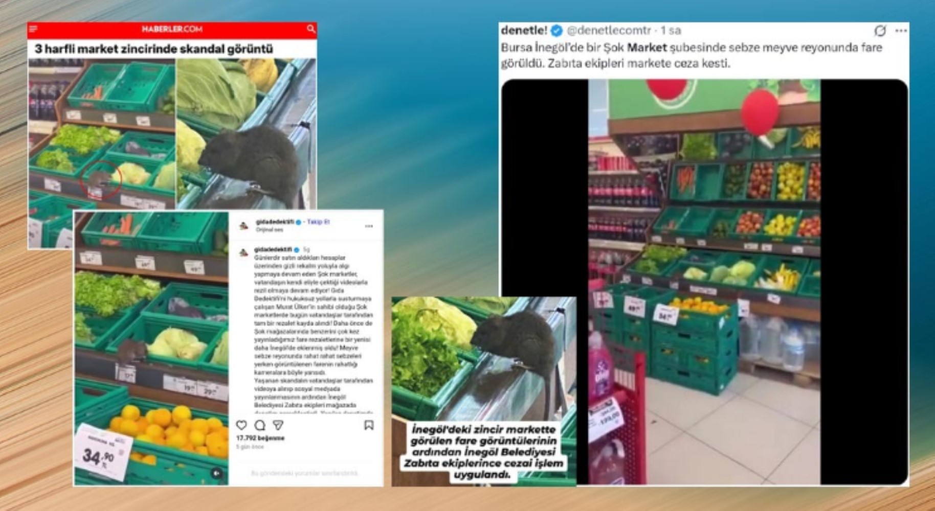 Önce “İnegöl’e dair her şey” adlı haber sitesinin, sonra da “Gıda Dedektifi”nin Instagram’dan paylaştığı görüntüde, marketin manav bölümünde dolaşan bir fare lahanayı didikliyordu. Bursa’nın İnegöl ilçesinde olan marketteki fare görüntüsünün yayılmasından sonra zabıta ekipleri marketi denetledi, ceza yazdı; farenin temas ettiği sebzeleri toplattı.