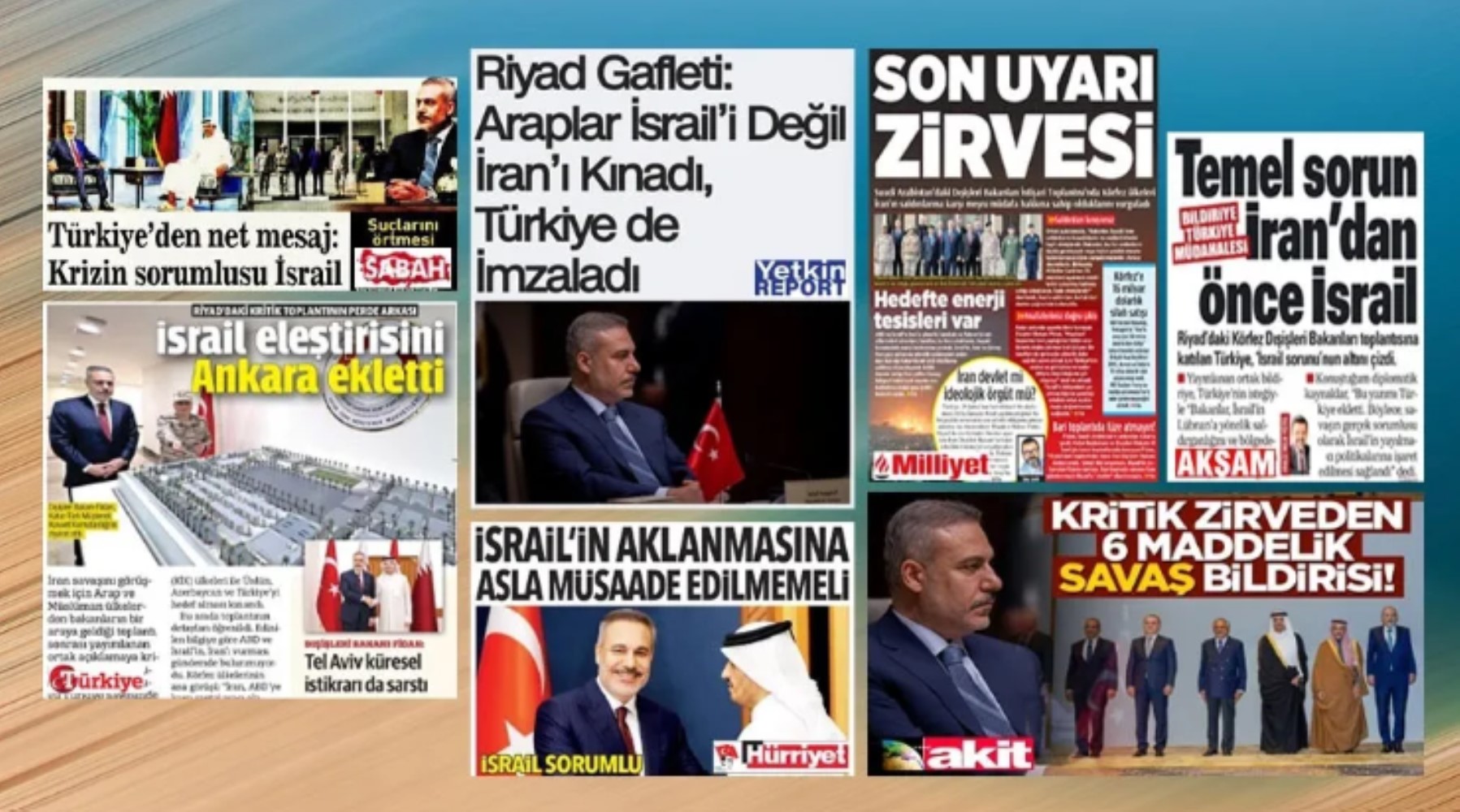 Bildiri ve Türkiye’nin tavrı böylesine açıkça ortadayken, iktidar yanlısı medya “Ortak Bildiri” haberlerinde manipülasyon yapmaktan geri durmadı. Bildirinin içeriğiyle ilgili haberi iç sayfaya atan Hürriyet, ilk sayfadan “İsrail’in kazanmasına asla müsaade edilmemeli” başlığıyla yayımladığı haberinde Fidan’ın “Savaşın birinci müsebbibi İsrail’dir” sözlerine yer verdi. Fidan’ın Doha’da dile getirdiği bu görüşün, saatler önce Riyad’da imzaladığı bildiriyle çelişmesine değinilmiyordu tabii ki…