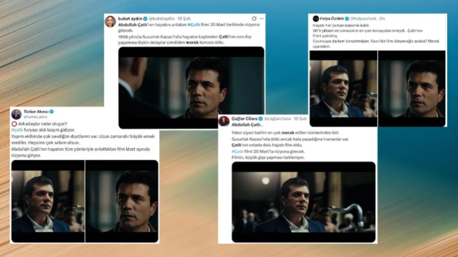 Buket Aydın paylaşımında “Çatlı’nın sıra dışı yaşamına ilişkin detaylar şimdiden merak konusu oldu” dedi. Çağlar Cilara da Çatlı için “yakın siyasi tarihin en çok merak edilen isimlerinden biri” diye yazdı. Sadece Türker Akıncı, “merak” demeden tanıttı filmi.