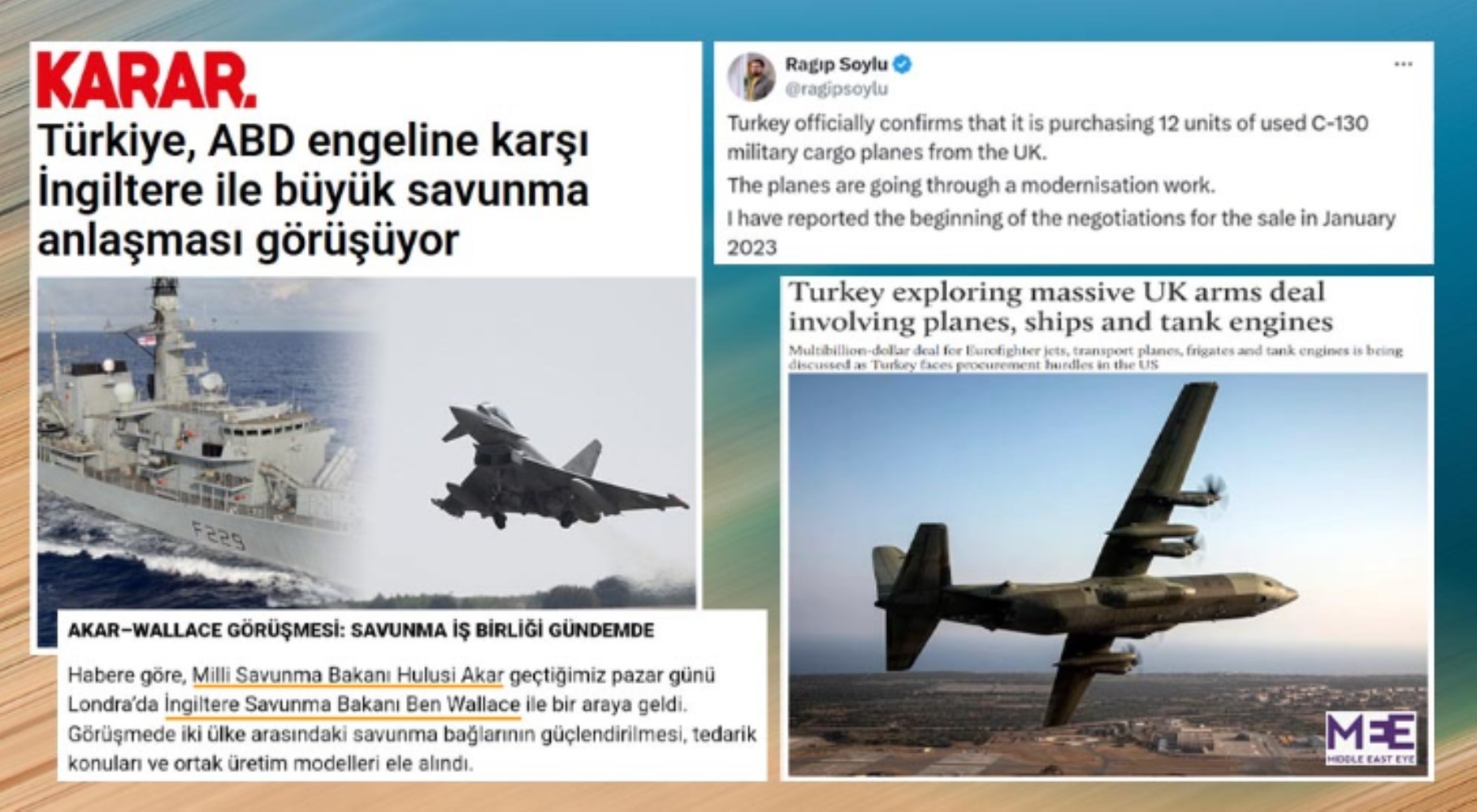 Ragıp Soylu bunu 16 Ekim’de saat 12.49’da paylaşmıştı. Saat 14.43’te, Karar’ın sitesinde bir haber yayımlandı: “Türkiye, ABD engeline karşı İngiltere ile büyük savunma anlaşması görüşüyor”. Enteresandır, Karar’da, Ragıp Soylu’nun paylaşımına eklediği eski haberdeki veriler aynen aktarılıyordu. Öyle ki, “Milli Savunma Bakanı Hulusi Akar’ın, geçtiğimiz pazar günü Londra’da İngiltere Savunma Bakanı Ben Wallace ile bir araya geldiği”nden söz ediliyordu!Halbuki artık ne Hulusi Akar Milli Savunma Bakanı, ne de Ben Wallace.