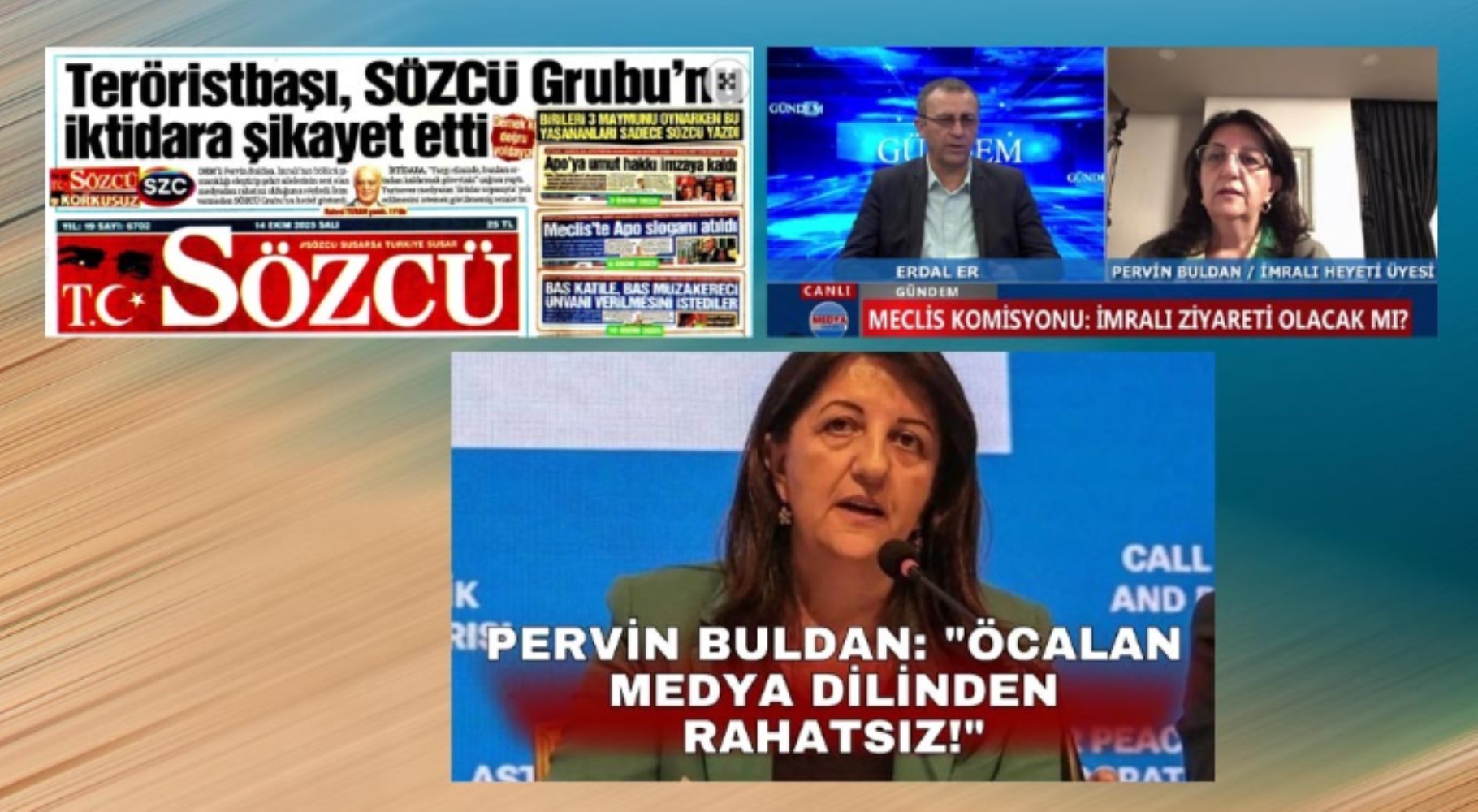 “Sayın Öcalan bu son görüşmede de rahatsız olduğu bir mesele üzerinde durdu, medyanın dili. Hâlâ birçok kanalın ve yorumcunun geçmişteki düşmanca dili sürdürdüğünü belirtti. Medyada bazı yorumcuların, bazı habercilerin, sürecin aleyhine ifadeler kullanması bizim çözeceğimiz bir sorun değil. Bu da iktidarın meselesi. Çünkü bugün medya da hükümetin elinde, AKP’nin elinde, yargı da AKP’nin elinde. Yaşamın her alanına hâkim bir iktidardan bahsediyoruz.”