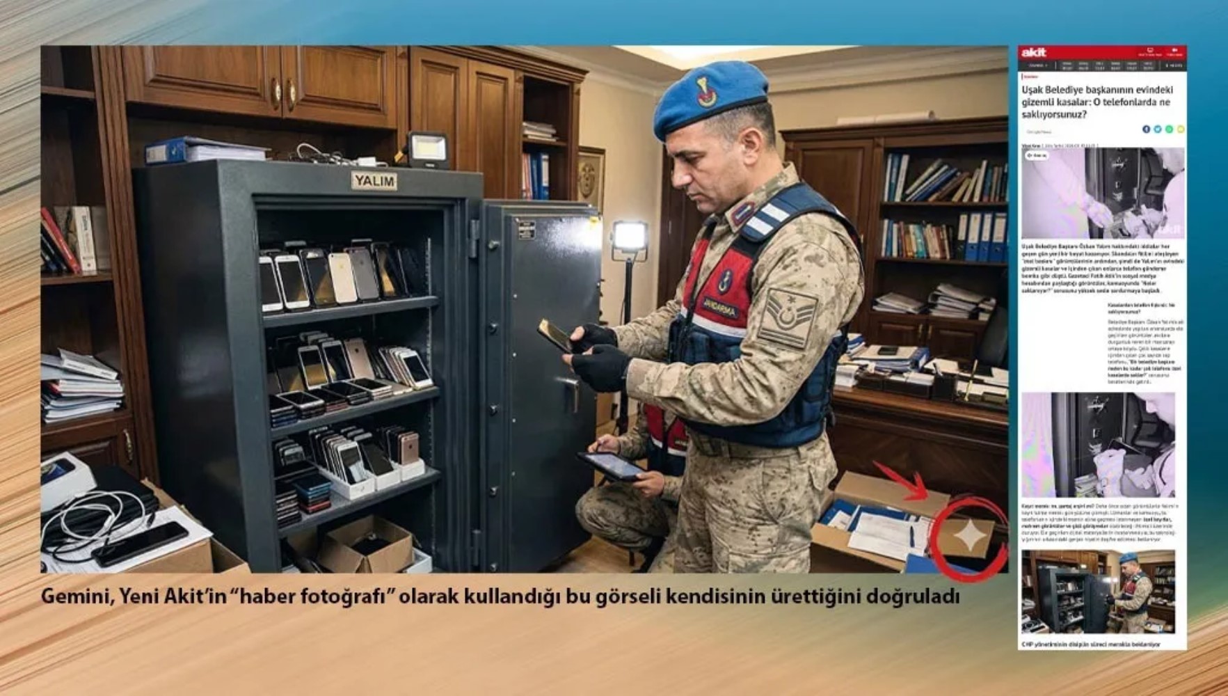 Yeni Akit, “Uşak belediye başkanının evindeki gizemli kasalar” haberinde, kasada iki cep telefonu bulunmasına rağmen onlarca telefon varmış gibi gösteren yapay zeka ürünü fotoğraf yayımladı; sonradan fotoğrafı kaldırdı ama “onlarca telefon” ifadesini değiştirmedi.