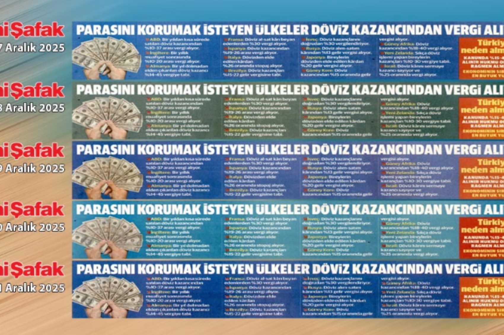 Yeni Şafak, “Parasını korumak isteyen ülkeler döviz kazancından vergi alıyor” başlıklı bir metni beş gündür sürmanşetten yayımlayarak bu konuyu kampanyaya dönüştürdü.
