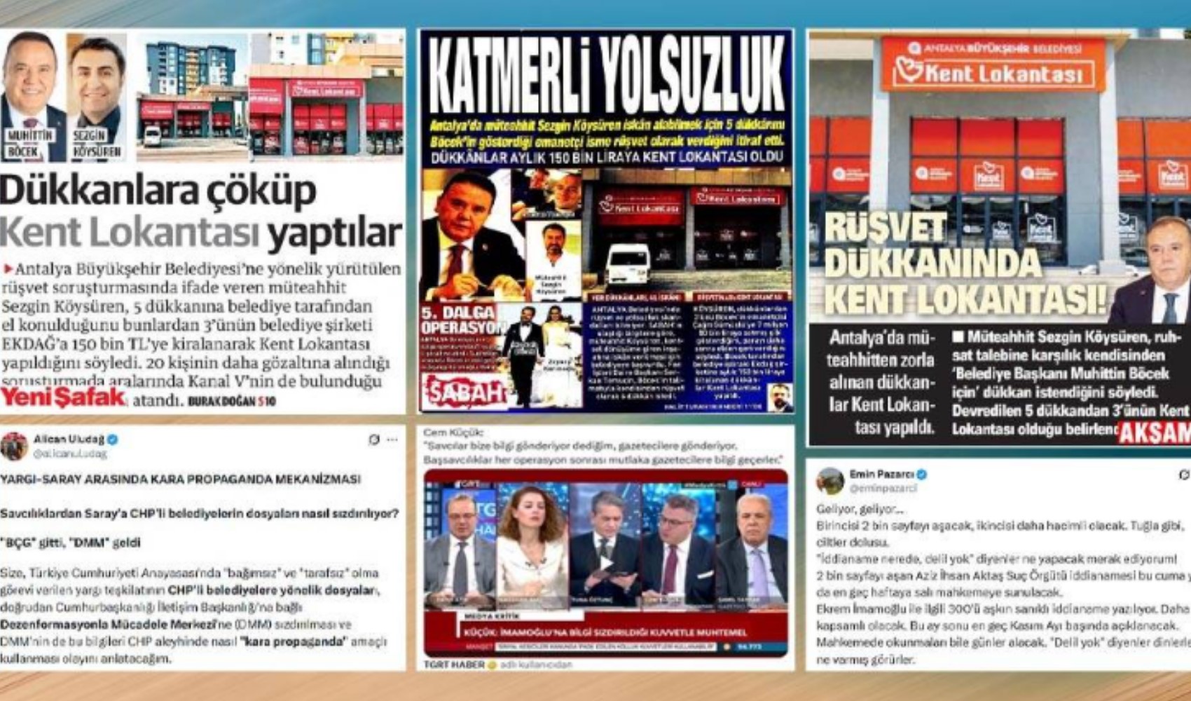 Bir örnek vereyim; 11 Eylül’de, Antalya Büyükşehir Belediyesi’ne yönelik soruşturmada gözaltına alınan müteahhit Sezgin Köysüren’in, “belediyenin beş dükkânına el koyduğu, üçünün Kent Lokantası yapıldığı” yolundaki ifadesi, Akşam’da “Rüşvet dükkânında Kent Lokantası”, Sabah’ta, “Katmerli yolsuzluk”, Yeni Şafak’ta ise “Dükkânlara çöküp Kent Lokantası yaptılar” başlıklarıyla yayımlandı. Sabah’ın haberinde Haber Müdürü Halit Turan’ın, Yeni Şafak’ın haberinde Burak Doğan’ın imzası yer alıyordu; ikisi de İstanbul’da görev yapıyor!