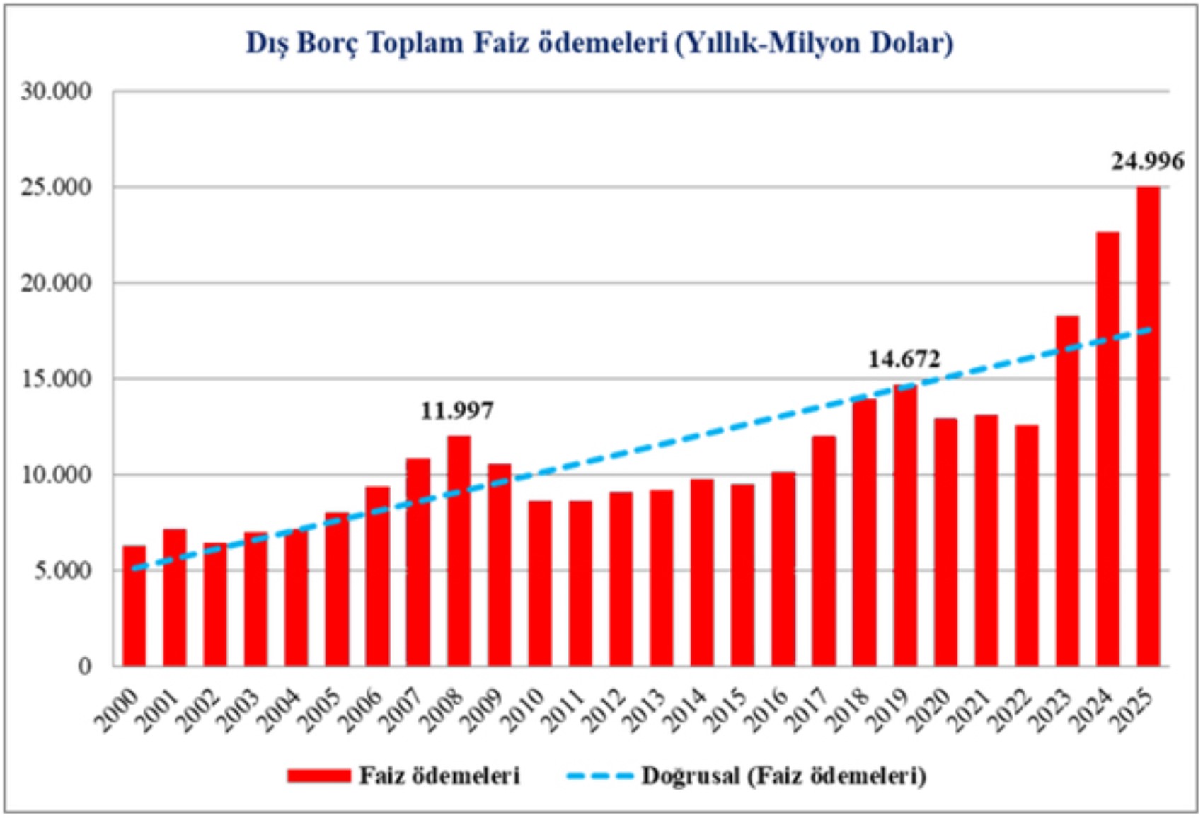Değerli dostum iktisatçı Prof. Dr. Yaşar Uysal’ın hazırladığı grafiğe dikkat çekmek isterim. Ödemeler bilançosu verilerine göre toplam faiz ödemelerinin (kamu+özel) gelişimi. Yıllık 5-6 milyar dolardan 25 milyar dolara... Prof. Uysal haklı olarak soruyor. Bu yol nereye çıkacak? Bu veri, borç yiyen kesesinden yer meselesini çoktan aştı. Kendi kesemizden değil, torunlarımızın kesesinden yiyoruz. Üstelik jeopolitiğimiz üzerindeki kontrolümüzü kaybederek, bağımsızlığımızı yitirerek.
