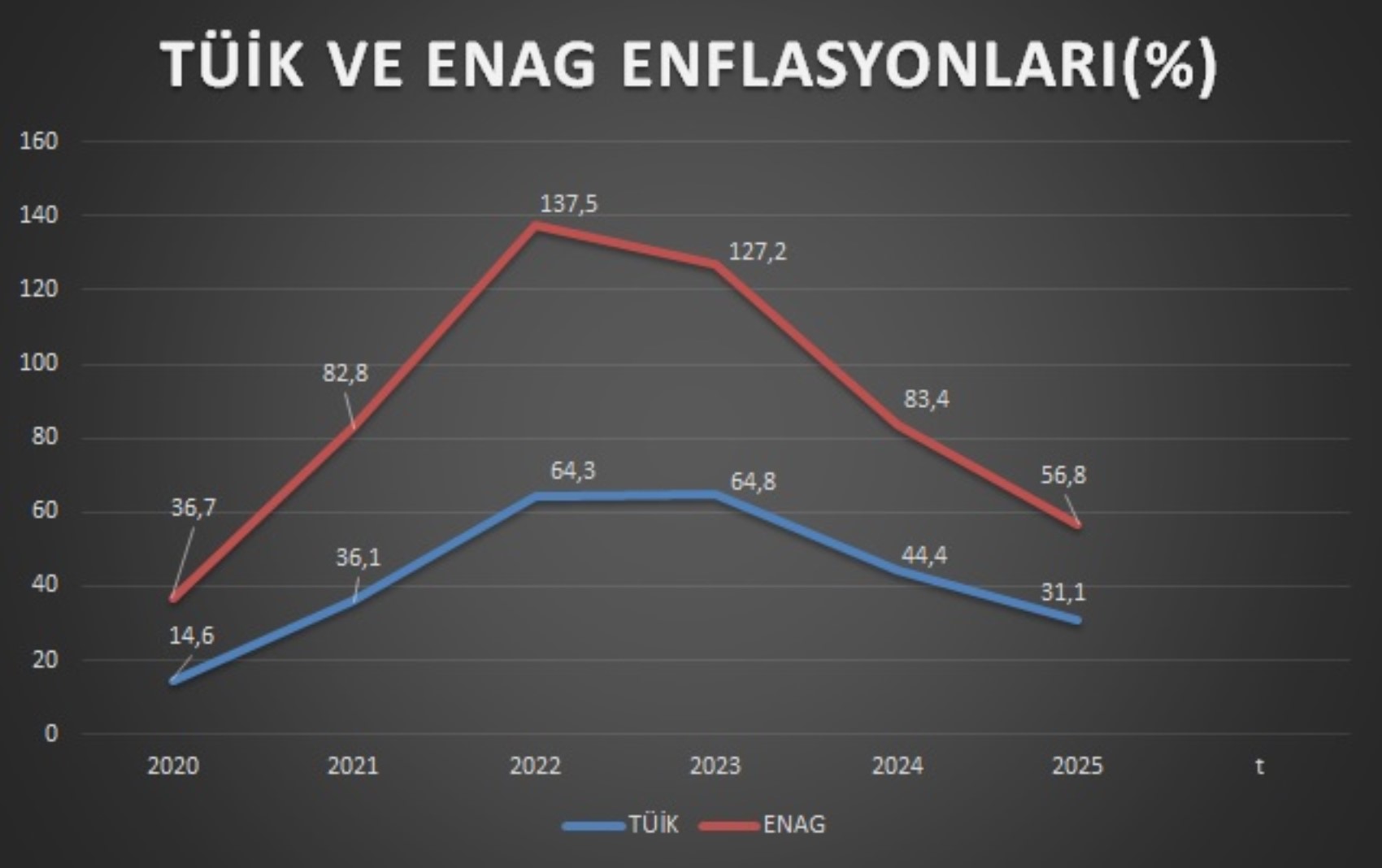 2020 yılı Ocak ayı başında fiyatlar genel seviyesini 100 olarak aldım ve her yıl gerçekleşen ENAG enflasyonu ile bugüne geldim. 2025 yılı Kasım sonunda ENAG’ın endeks değeri benim hesabıma göre 3911 olmuş. (ENAG açıklamalarında endeks değeri vermiyor. Ben her yılın enflasyonunu alıp birikimli olarak bu veriyi buldum.)