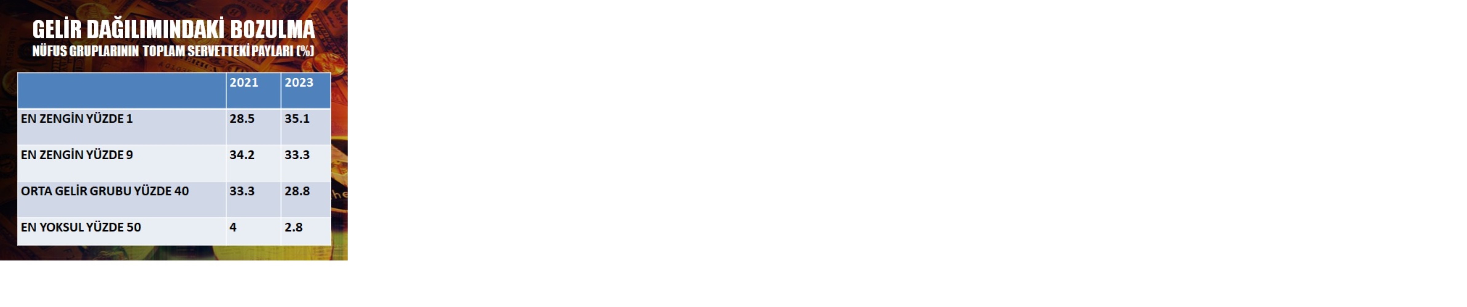 Özellikle 2021 yılı Ekim ayından sonra uygulanan para ve faiz politikaları sonucunda toplumda yoksullardan en üst gelir grubuna doğru müthiş bir servet transferi yaşandı. Paris Ekonomi Okulu’nun hazırladığı Dünya Eşitsizlik Raporu veri tabanına göre (The World Inequality) Türkiye’de nüfusun en yoksul yüzde 50’si toplam servetin yüzde 4’ünü alırken, 2023 sonunda toplam servetleri yüzde 2.8’e gerilemiş. Orta gelir gurubunun serveti yüzde 33.3’ten yüzde 28.8’e düşmüş. Ama işin en ilginç tarafı en zengin yüzde 9’un da serveti yüzde 34.2’den yüzde 33.3’e gerilemiş. 86 milyon kişi, nüfusun yüzde 1’ine çalışmış. Ekonomi büyümüş, sadece nüfusun yüzde 1’inin serveti artmış. Yüzde 28.5’ten yüzde 35.1’e yükselmiş.