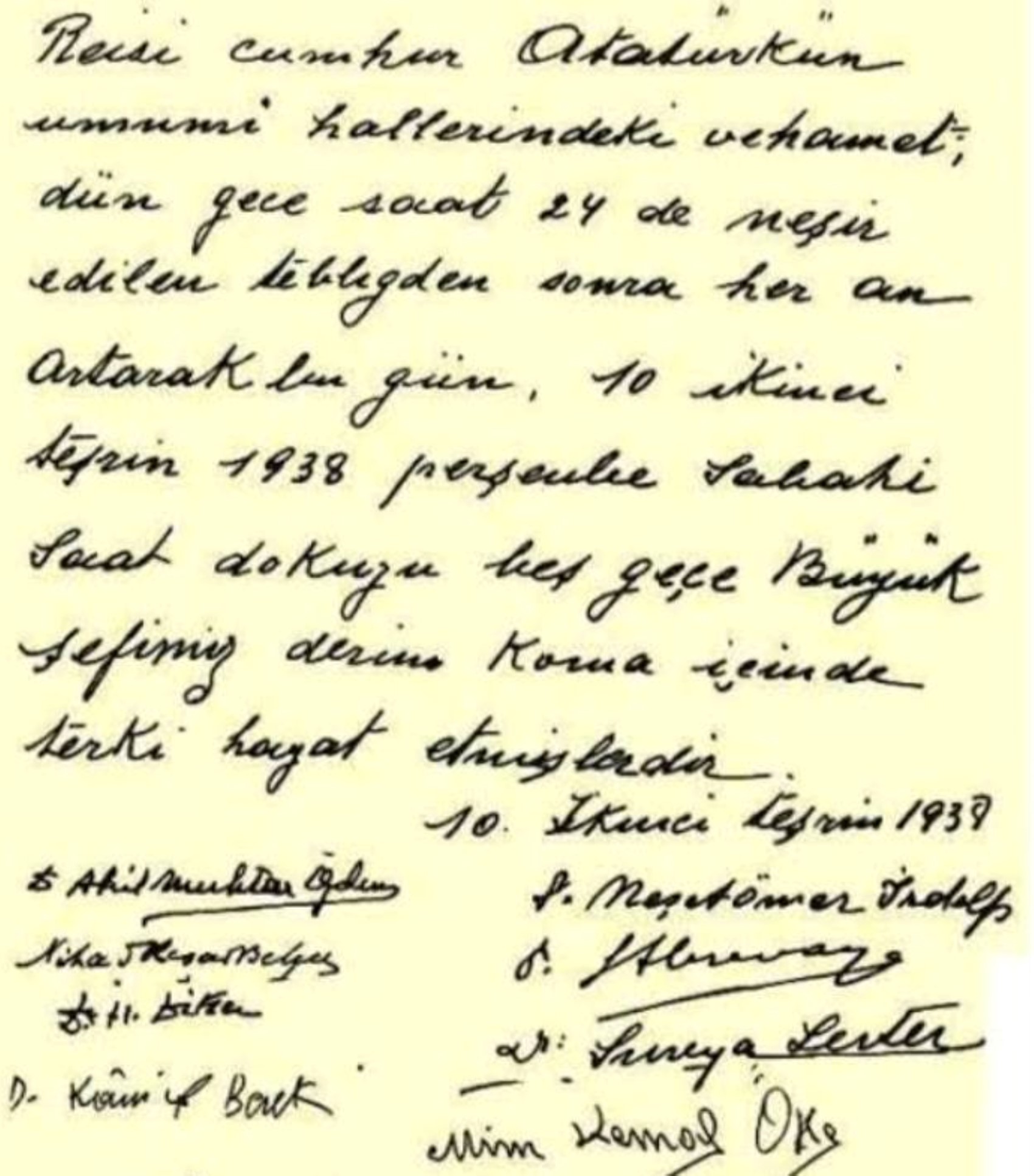 Gazi’nin sağlık durumunun ciddiyeti anlaşılınca Başvekil Celal Bayar bazı kararlar verdi. Öncelikle Türkiye’nin en tanınmış doktorlarından oluşan bir heyet kurdu. Bir çoğu İstanbul Tıp Fakültesinde öğretim üyesi olan doktorlar şunlardır. Neşet Ömer İrdelp, Akil Muhtar Özden, Mim Kemal Öke, Abravaya Marmaralı,Nihat Reşat Belger.
