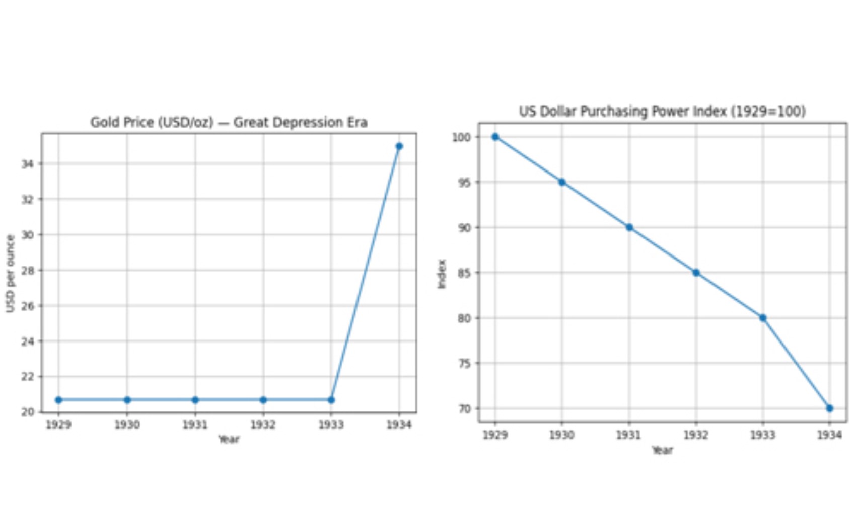 ABD’de 1929’da Başkan Herbert Hoover döneminde başlayan “Büyük Buhranı/Krizi” gidermek için Başkan Franklin D. Roosevelt yönetiminde 1933–34’te alınmaya çalışılan önlemlerle altının dolar cinsinden fiyatı %69.33 artmış (20.67 › 35).