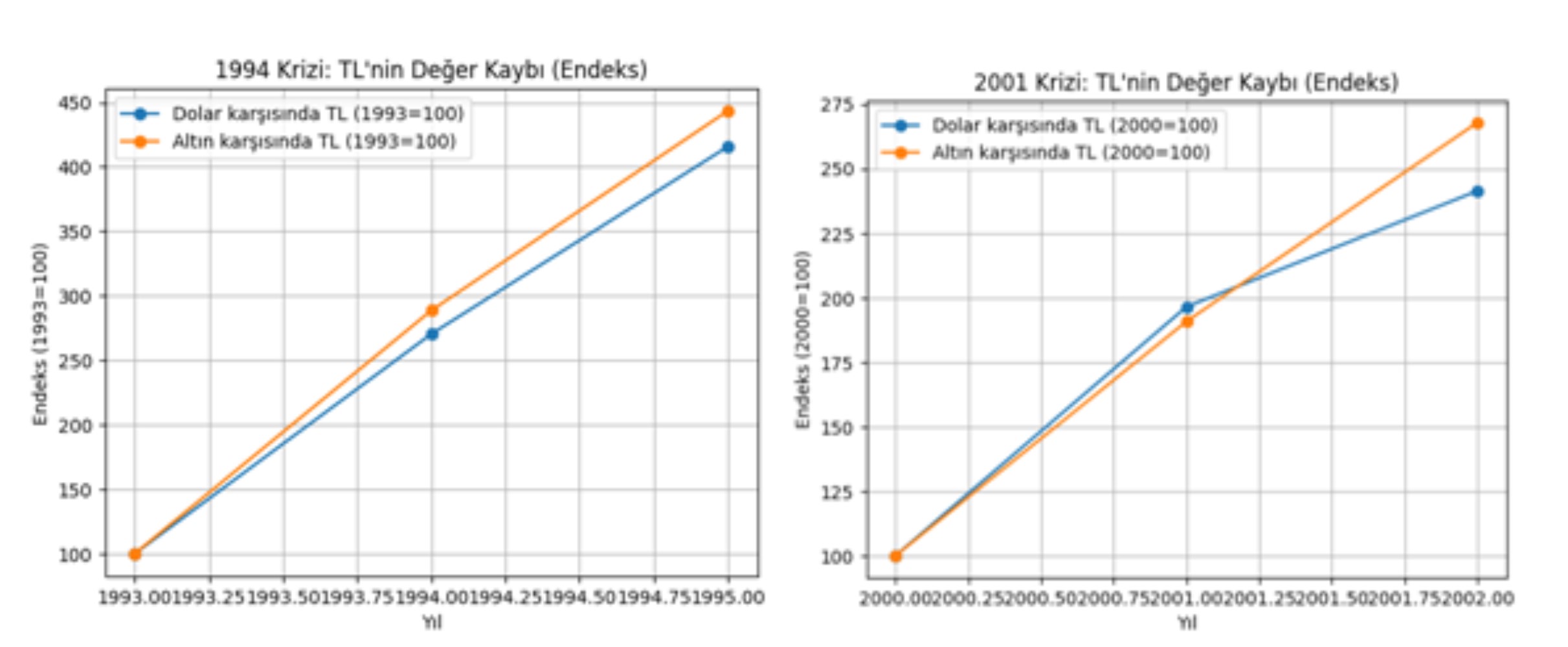 (1994 krizinde altın TL karısında 4.5 kat, 2001 yılında 2.75 kat değer kazanmış)