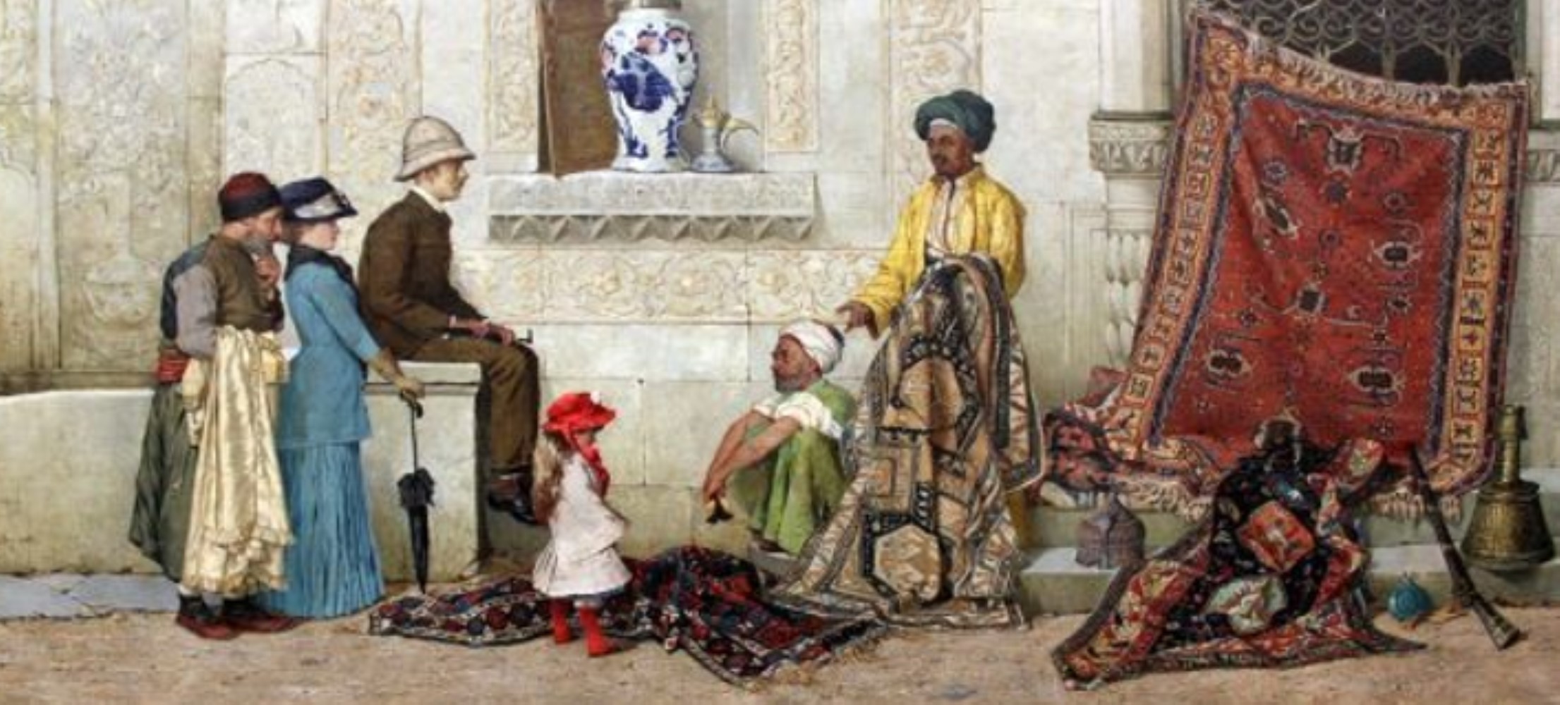 Bu tabloda, Alman’a benzeyen Batılı yabancılar veya tüccarlar, yanlarında hizmetçileriyle birlikte İstanbul’da bir sokakta, Doğulu yerel satıcılardan halı almak için muhtemelen pazarlık yapmaktadır.