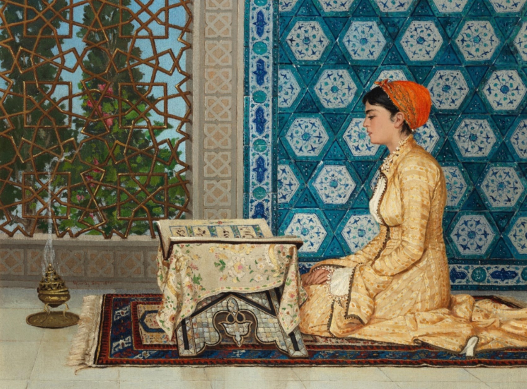 “Şu anda nerede olduğu bilinmeyen bu tabloyu Osman Hamdi, kendi üslup özelliklerine uygun biçimde, süslü bir mihrabın önünde büyük bir rahleye oturmuş sarı elbiseli bir kadın figürüyle; önünde tüten bir buhurdan ve yere dağılmış kitaplarla resmetmiştir.”