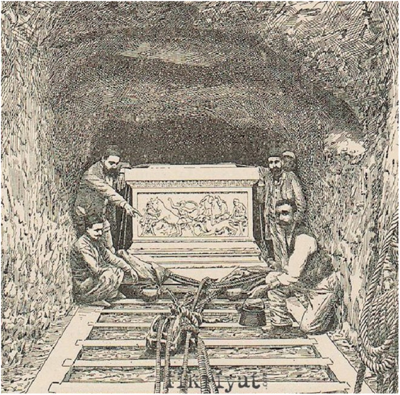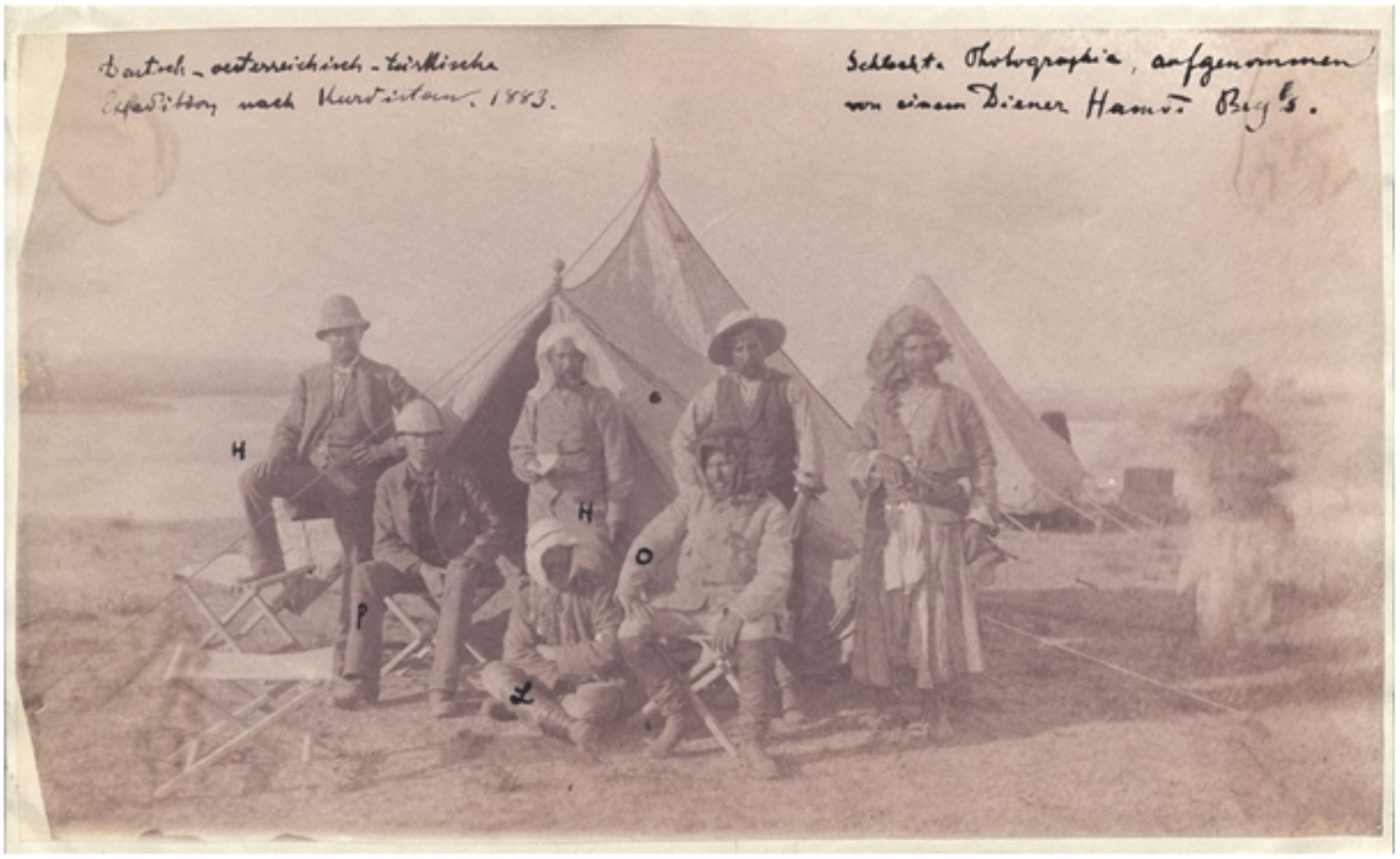 (Gaziantep soygununu başlatan ve yürüten ekip. Carl Humann, Otto Puchstein, Felix von Luschan, Osman Hamdi, ve Yervant Osgan Nemrud Dağı yakınında-1883. Foto ve alt yazı: F.von Lushcan)