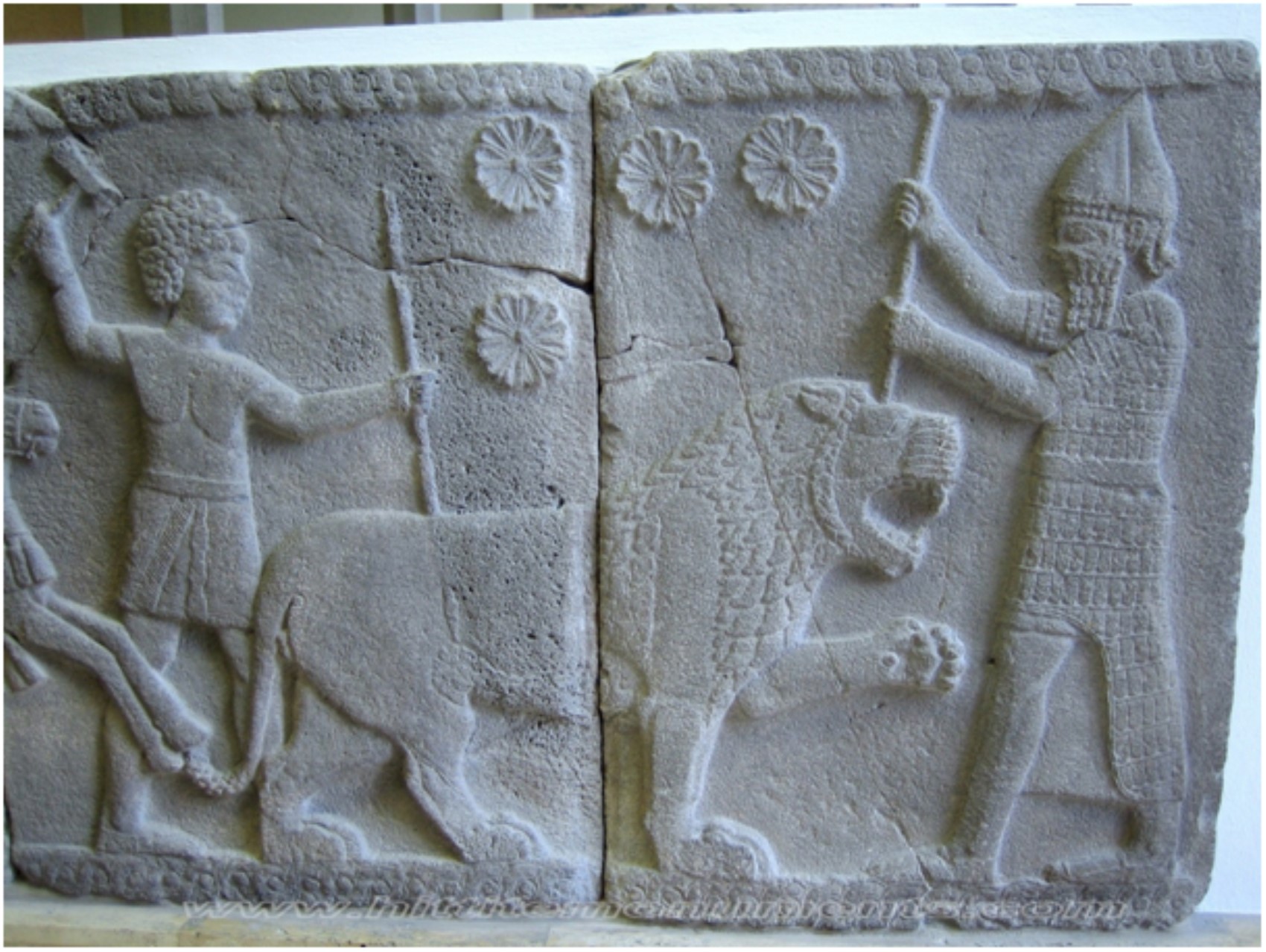 (Sakçagözü’nde bulunmuş, taşlar kesilip traşlanarak Berlin’e kaçırılmış, ünlü aslan avını gösteren kabartmanın ilk kısmı. Berlin Vorderasiatisches/Önasya Müzesi)