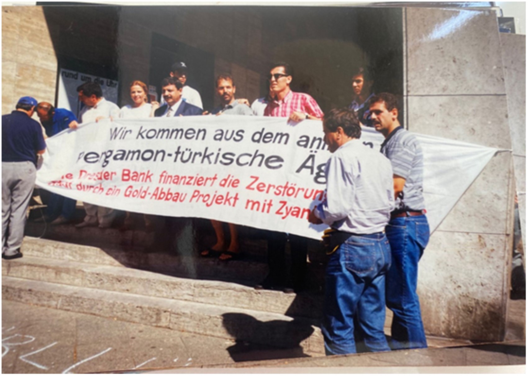 (9 Ağustos 1995. Bergama Belediye Başkanı Sefa Taşkın, eşi Macide Taşkın, Belediye Meclis üyesi Rıfat Korkmaz, halkla ilişkiler sorumlularından Şükret Sevgener ve Bergamalılar Berlin’de Dresdner Bank önünde protesto gösterisi yapıyor.)