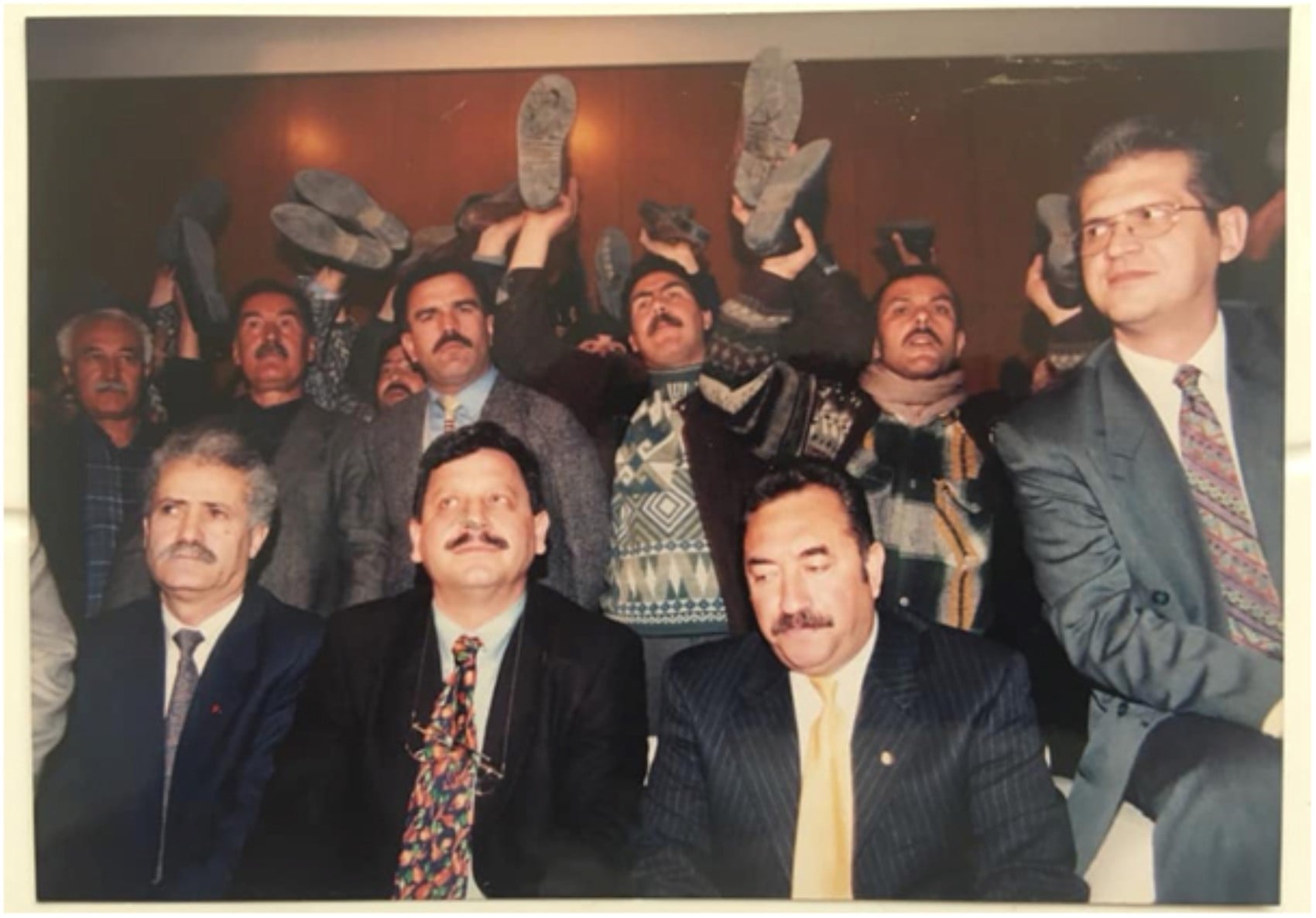 (Bergama’da siyanürlü madenden etkilenen köylerin muhtarları, yurttaşlar, CHP İzmir İl Başkanı Memiş Yıldırımcan, İzmir–Konak Belediye Başkanı Ahmet Sarışın, CHP İzmir–Karşıyaka İlçe Başkanı Hüseyin Çalışkan, Avrupa Parlamentosu’nda Bergama ile ilgili konuşma yapmak için giden Belediye Başkanı Sefa Taşkın’ı İzmir Adnan Menderes Havaalanı’ndan yolcu ediyor. Köylüler simgesel olarak ayakkabılarını çıkarıyor.)