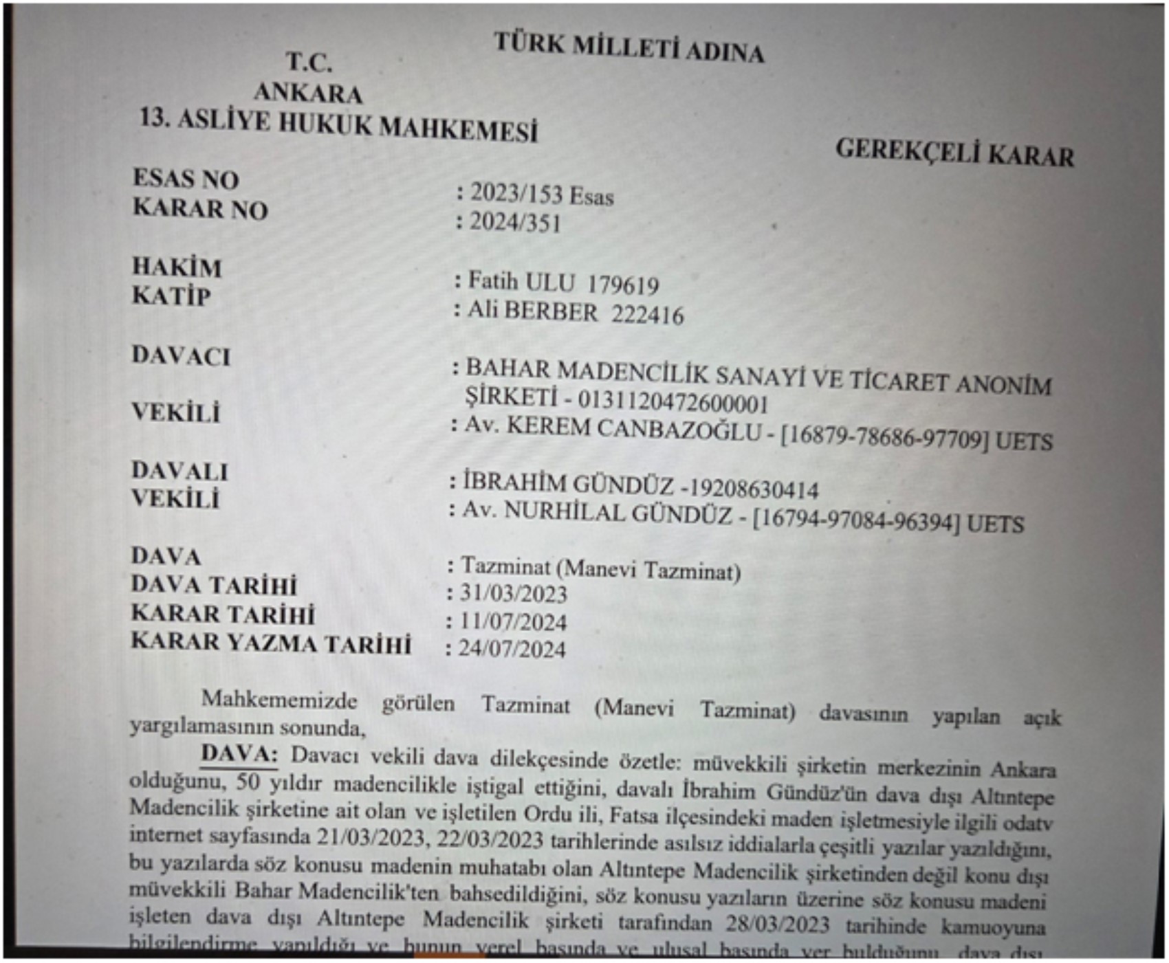 Bu süreçte, Fatsa-Altıntepe siyanürlü altın madeninde yaşanan yağmur taşkını felaketi sonucu madenin kirli sularının çevre derelere karıştığı yönünde olayla ilgiligörüntülü bir haber yapan gazeteci İbrahim Gündüz’e“asılsız haber yazdığı”ve “kişilik haklarına saldırıldığı gerekçesiyle” 500 milyon TL’lik tazminat davası açan Bahar Madencilik Şirketinin bu talebiAnkara 13.Asliye Hukuk Mahkemesi”tarafından reddedilir.